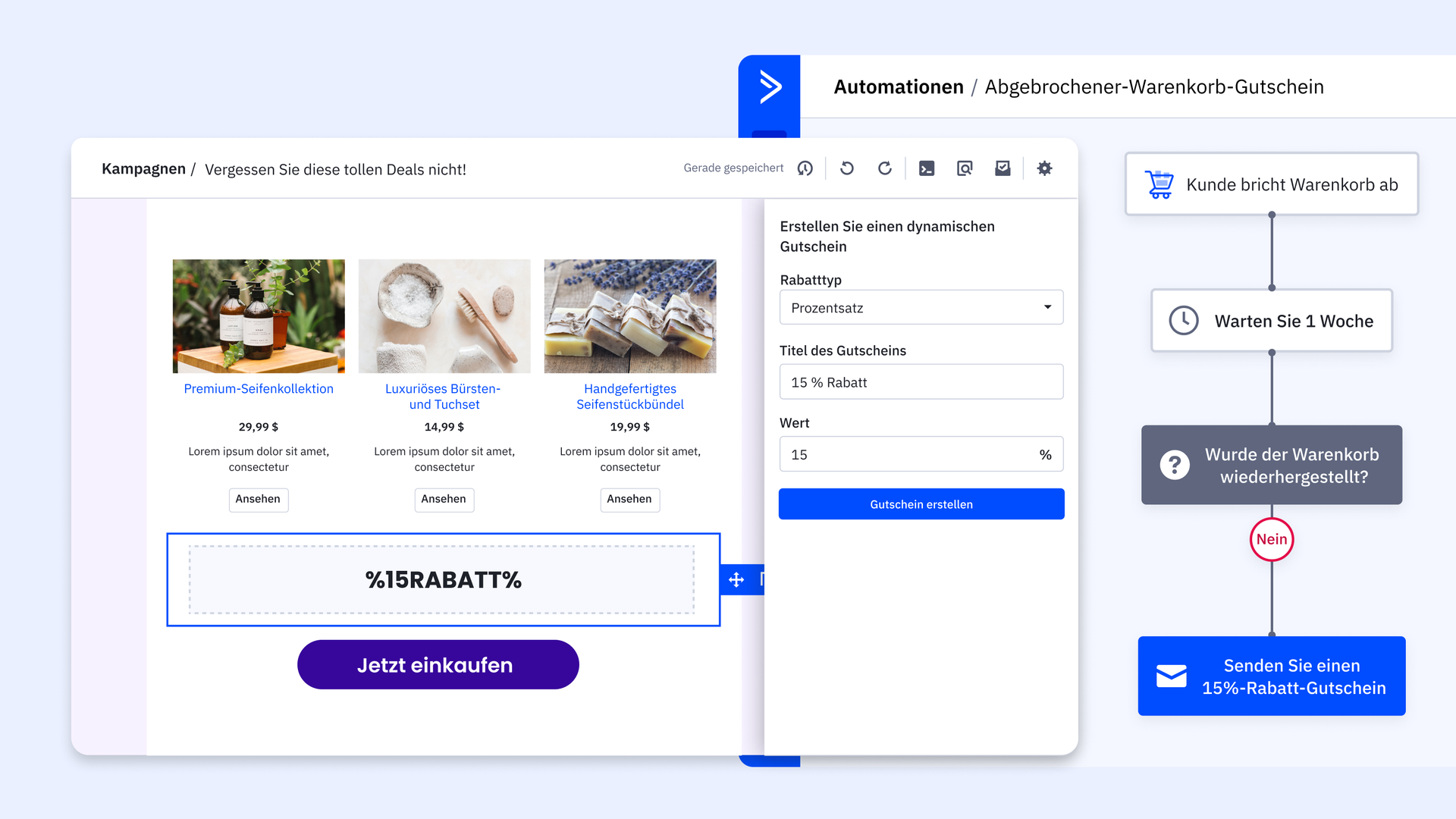 - Stelle abgebrochene Warenkörbe wieder her: Sende automatisierte E-Mails mit einem Gutscheincode an Kunden, die Artikel in ihrem Warenkorb liegen gelassen haben. Dadurch werden sie ermutigt, zurückzukehren und ihren Einkauf abzuschließen, was die Abbruchrate verringert.