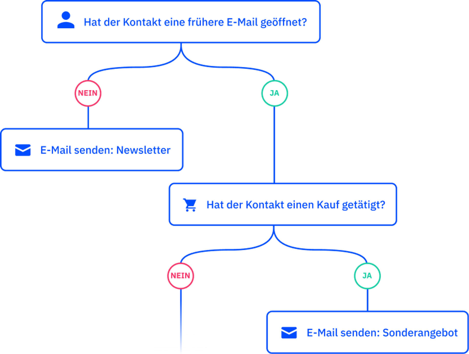 Zum Beispiel: Zwei Personen tragen sich in Ihre E-Mail-Liste ein und erhalten eine Willkommensnachricht. Wenn eine Person mit dieser E-Mail interagiert, können Sie ihr eine weitere automatisierte E-Mail mit einem Rabatt für das Produkt senden, das sie sich angesehen hat. Wenn die andere Person nicht mit der E-Mail interagiert, können Sie Ihr automatisiertes System veranlassen, ihr eine andere Version der Willkommens-E-Mail zu senden und dabei den Titel und den Wortlaut zu ändern.