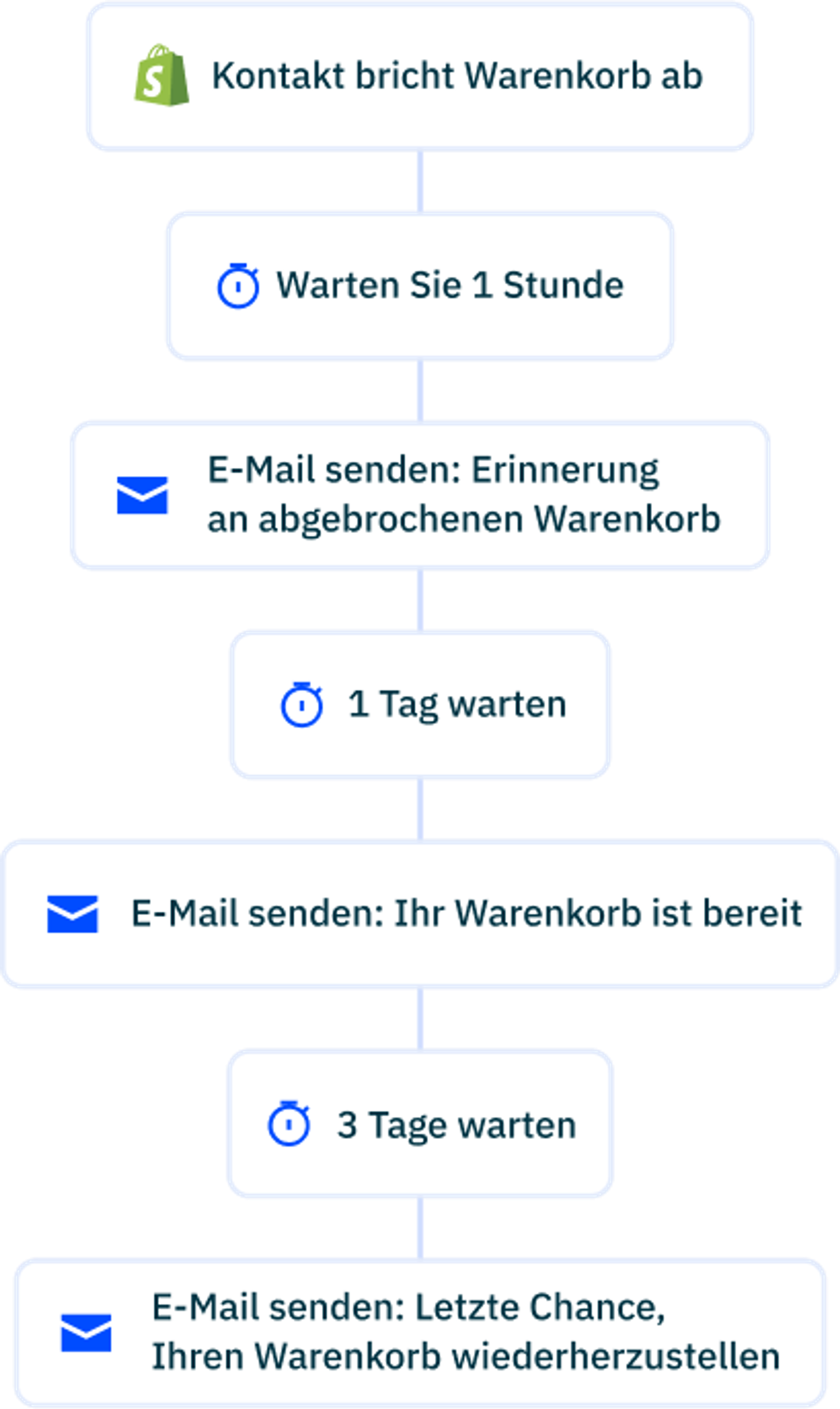 Nehmen wir an, ein potenzieller Kunde bricht seinen Warenkorb in Ihrem Online-Shop ab. Anstatt die Zeit Ihres Marketingteams dafür zu verwenden, sich einzeln mit ihm in Verbindung zu setzen (oder schlimmer noch, sich überhaupt nicht mit ihm in Verbindung zu setzen), können Sie mit der Retargeting-Automation nach einem bestimmten Zeitraum eine E-Mail versenden. Sie sollten verschiedene Möglichkeiten ausprobieren, um Ihre potenziellen Kunden dazu zu bringen, den Kauf eines Artikels noch einmal in Betracht zu ziehen.