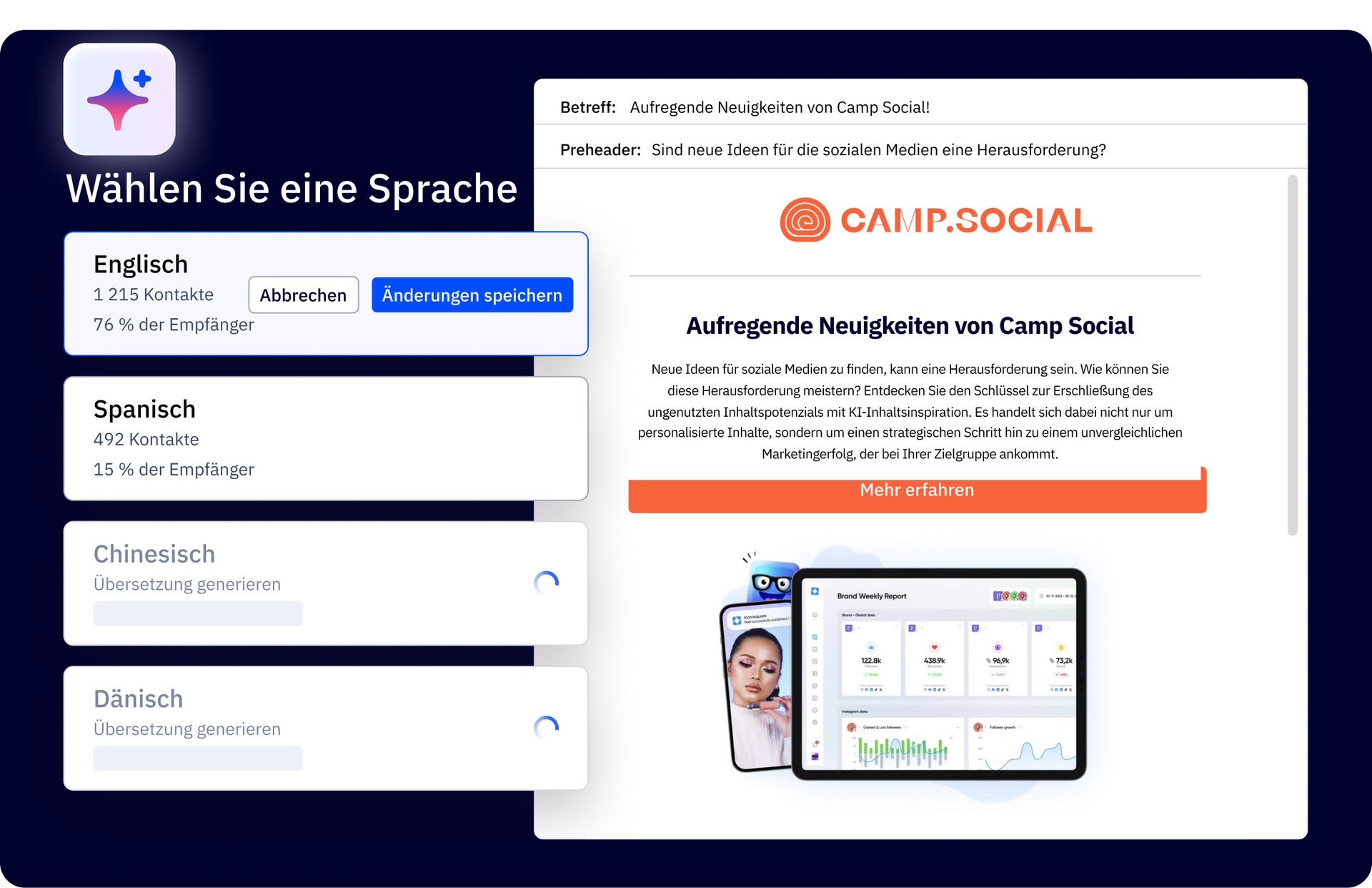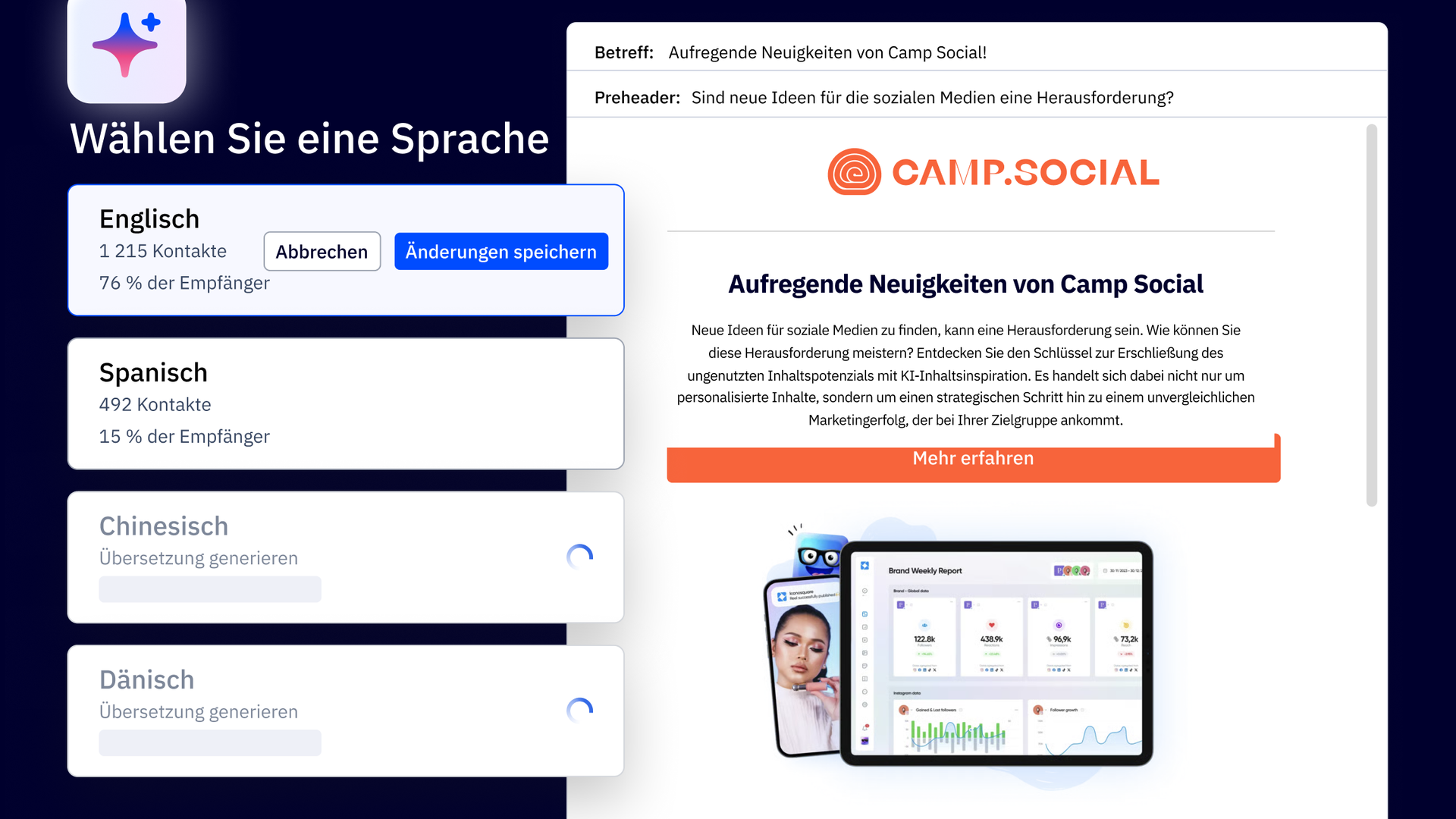 Von da an sollte Ihr Workflow Sprache als eine Zustellungsentscheidung behandeln, nicht als eine separate Kampagne. Wenn KI-Übersetzungen aktiviert sind, liest das System die Sprachpräferenz jedes Kontakts und erstellt automatisch die entsprechende Version Ihrer E-Mail. Mit der Unterstützung für mehr als 75 Sprachen können Sie fast jeden globalen Markt erreichen, ohne mit mehreren Listen jonglieren zu müssen.