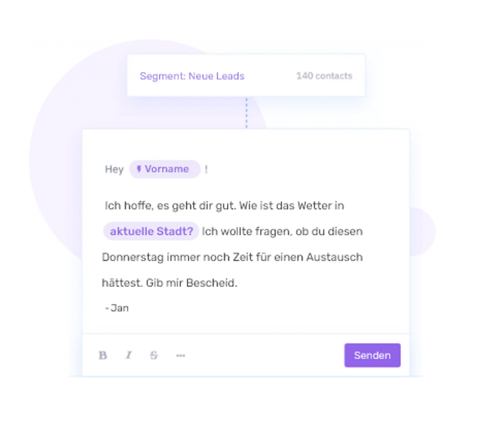 Aber es reicht nicht aus, den Namen des Abonnenten hinzuzufügen oder einen bestimmten Rabatt anzubieten. Es ist wichtig, dass du personalisierte Inhalte versendest und eine persönliche Verbindung zu jedem Abonnenten aufbaust. Um dies zu erreichen, musst du einige wichtige Elemente deiner Kampagne berücksichtigen: Segment, Zeitpunkt, Betreffzeile, Inhalt, Angebot und Signatur.