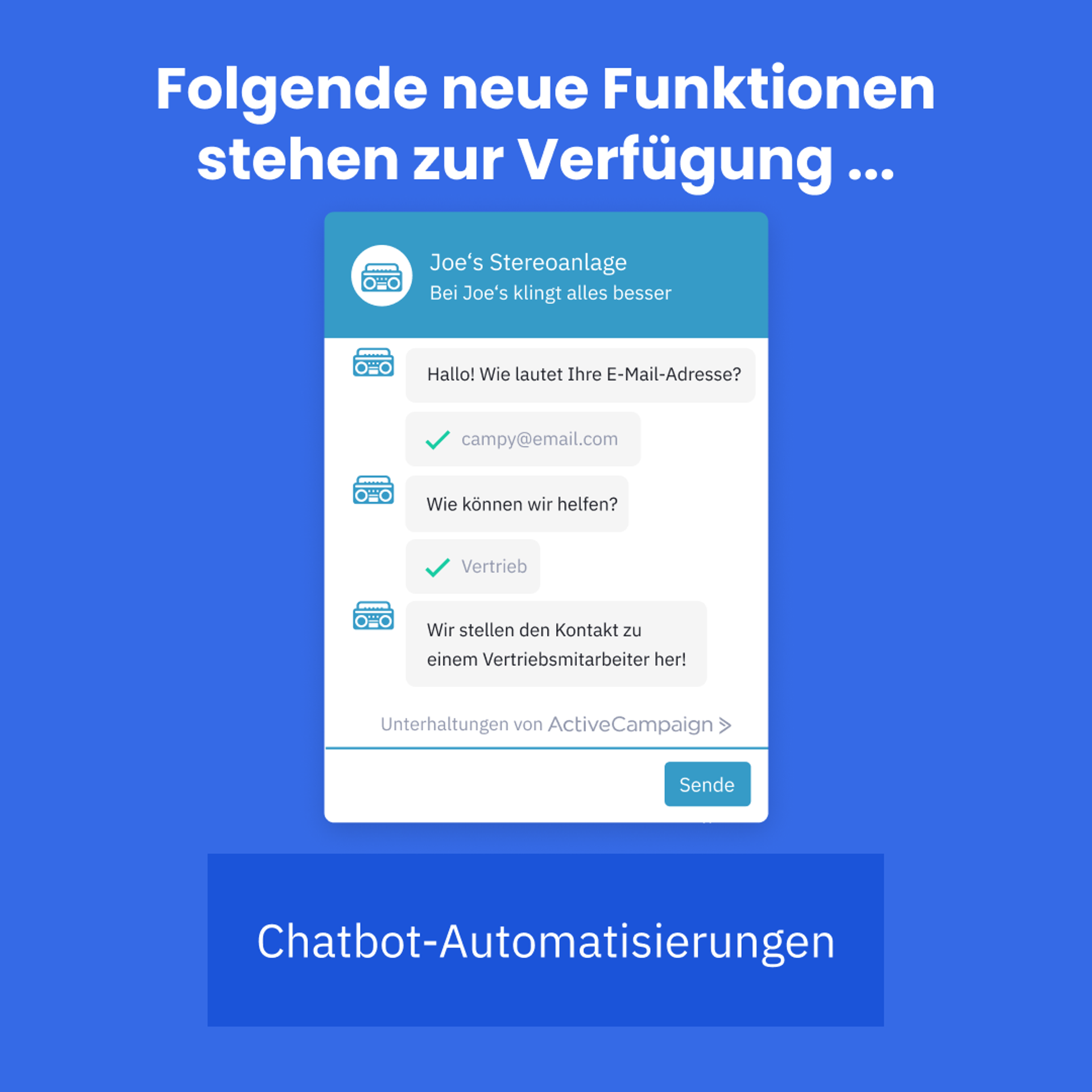 Mit ActiveCampaign bist du in jedem Fall höchst flexibel. Du kannst jeder Mail eine beliebige Absenderadresse zuweisen, kannst weitere Kontaktmöglichkeiten (Whatsapp, Social Media, Live Chat) oder auch Buttons anbieten, um mit einer Person oder Abteilung in Kontakt zu treten.