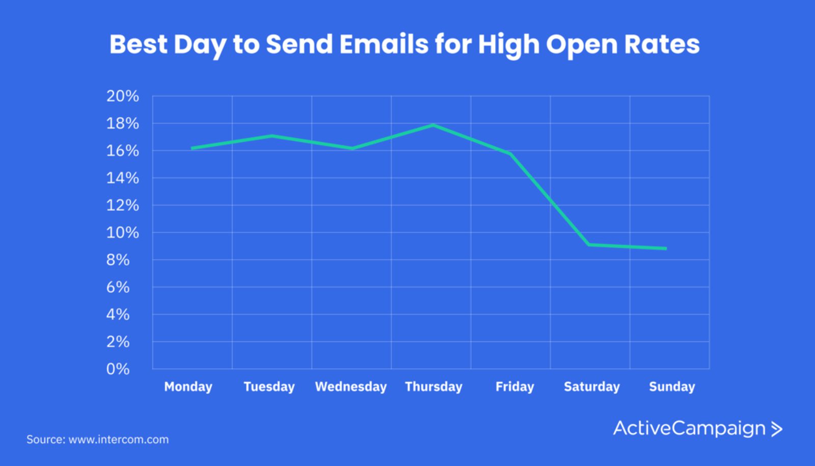 Die Ergebnisse der Intercom-Datenbank zeigen, dass der Dienstag die höchsten Öffnungsraten aufweist, dicht gefolgt vom Donnerstag. Der Mittwoch scheint effektiver zu sein als der Montag und Freitag, liegt aber relativ weit hinter Dienstag und Donnerstag.