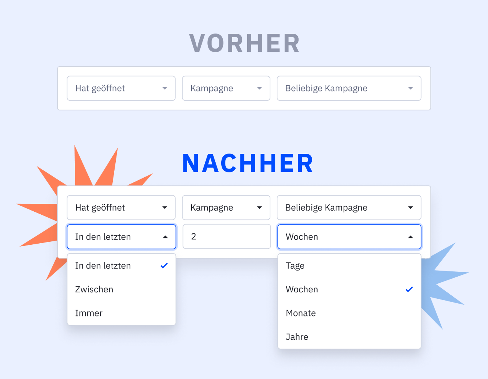 Im Folgenden findest du ein Beispiel dafür, wie ActiveCampaign neue Funktionen mithilfe von Vorher-Nachher-Bildern präsentiert.