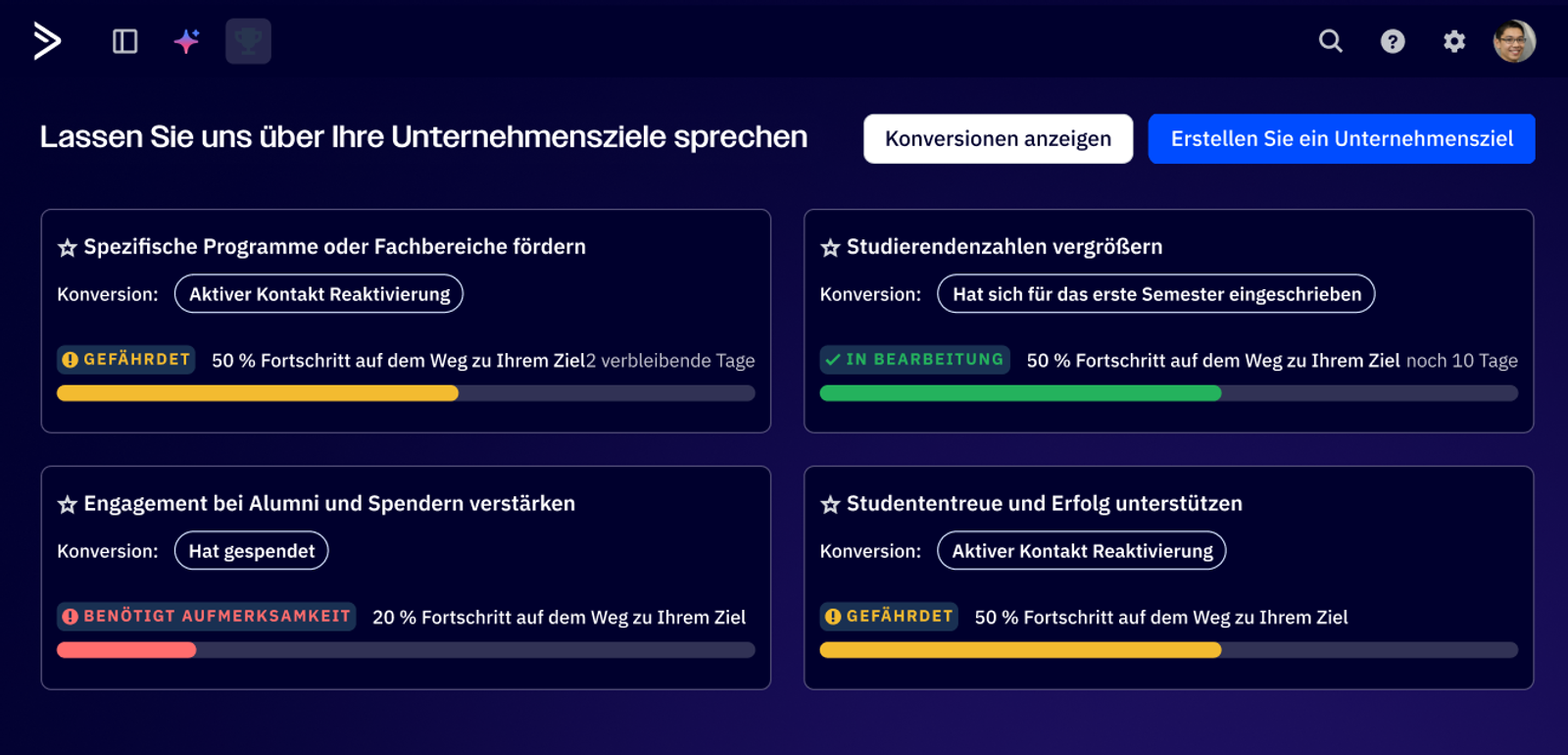 Das Unternehmensziel-Dashboard von ActiveCampaign verfolgt den Fortschritt bei den vier wichtigsten institutionellen Zielen mit Echtzeit-Statusindikatoren und Countdowns für Fristen.