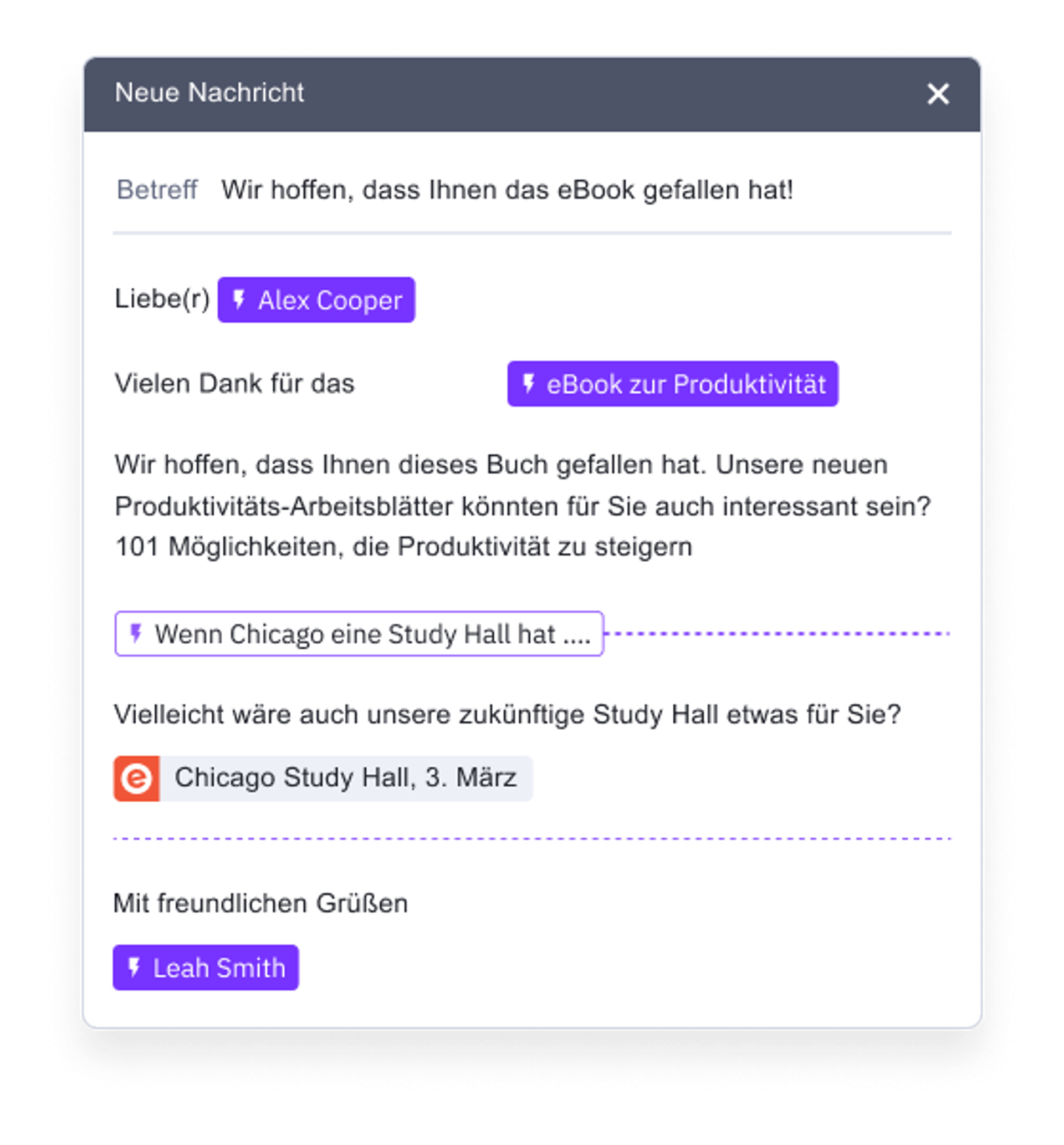Richte deine Botschaften auf diese entscheidenden Phasen aus. Wenn dein Kunde eine Pause von der Arbeit braucht, schicke ihm eine Ressource, die ihn von seiner Routine ablenkt; wenn das Wochenende naht, teile ihm etwas Interessantes mit, das die Woche ausklingen lässt und ihm Freiraum verschafft, usw.