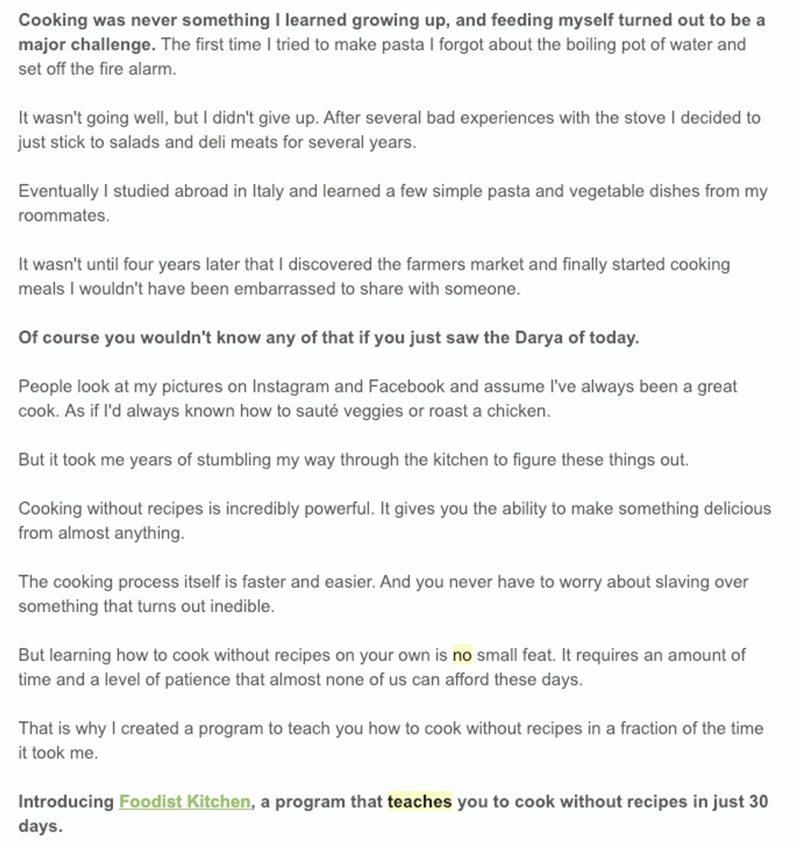 Hier haben wir ein E-Mail-Beispiel für eine Willkommens-Mail Nr. 5 von Conversion-Copywriterin Joanna Wiebe. Sie gibt den Lesern ganz genaue Bilder davon, wie ihr Leben aussehen wird, wenn sie das Produkt nicht kaufen.