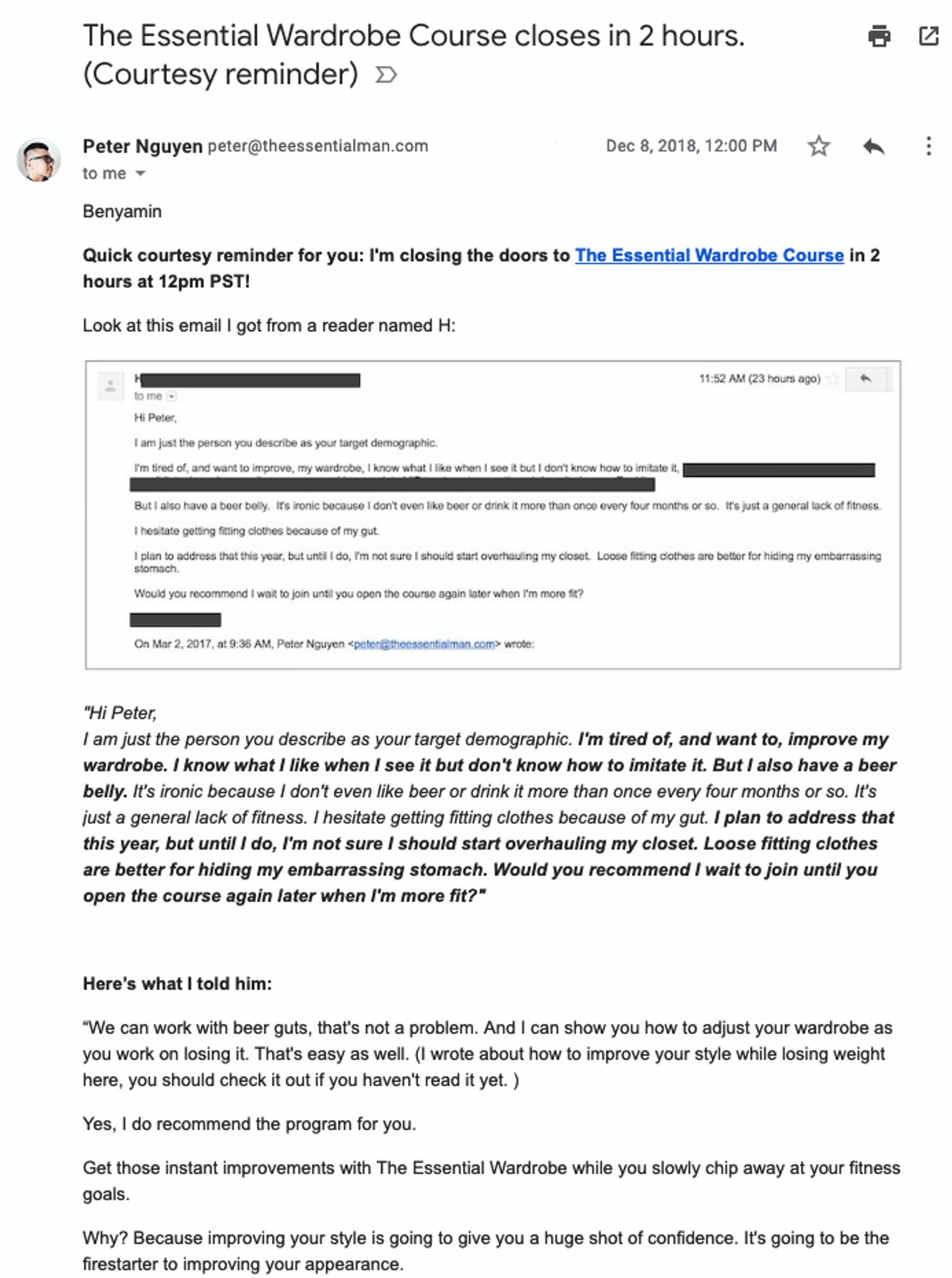 Hier ist ein Beispiel für eine überzeugende Willkommens-Mail am Ende der Begrüßungssequenz des US-amerikanischen Style-Coaches Peter Nguyen (von The Essential Man). Es wird ein Screenshot von einer E-Mail präsentiert, in der ein Leser Nguyen fragt, ob es sinnvoll für ihn ist, an dem Style-Kurs für Männer teilzunehmen, obwohl er noch einen Bierbauch hat, den er eigentlich erst noch loswerden möchte. Nguyen entkräftet den Einwand und verweist auf einen Blog-Post über genau dieses Problem.