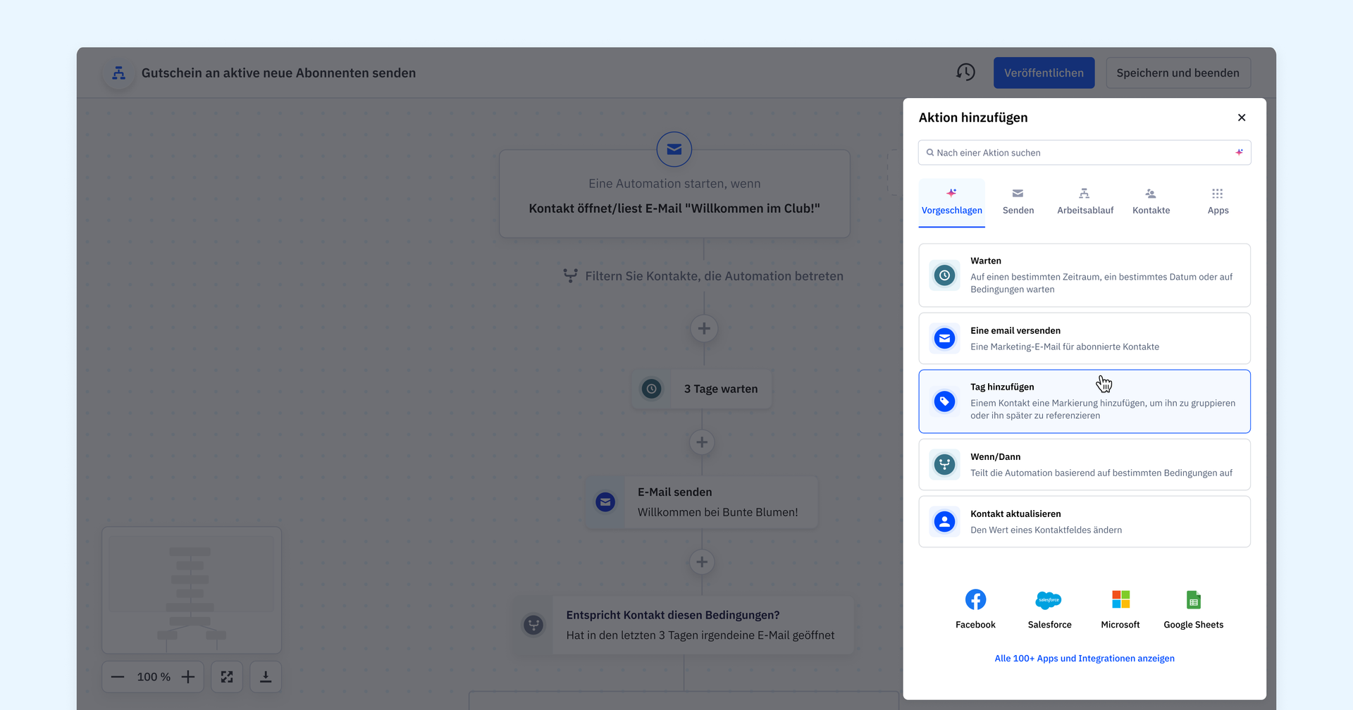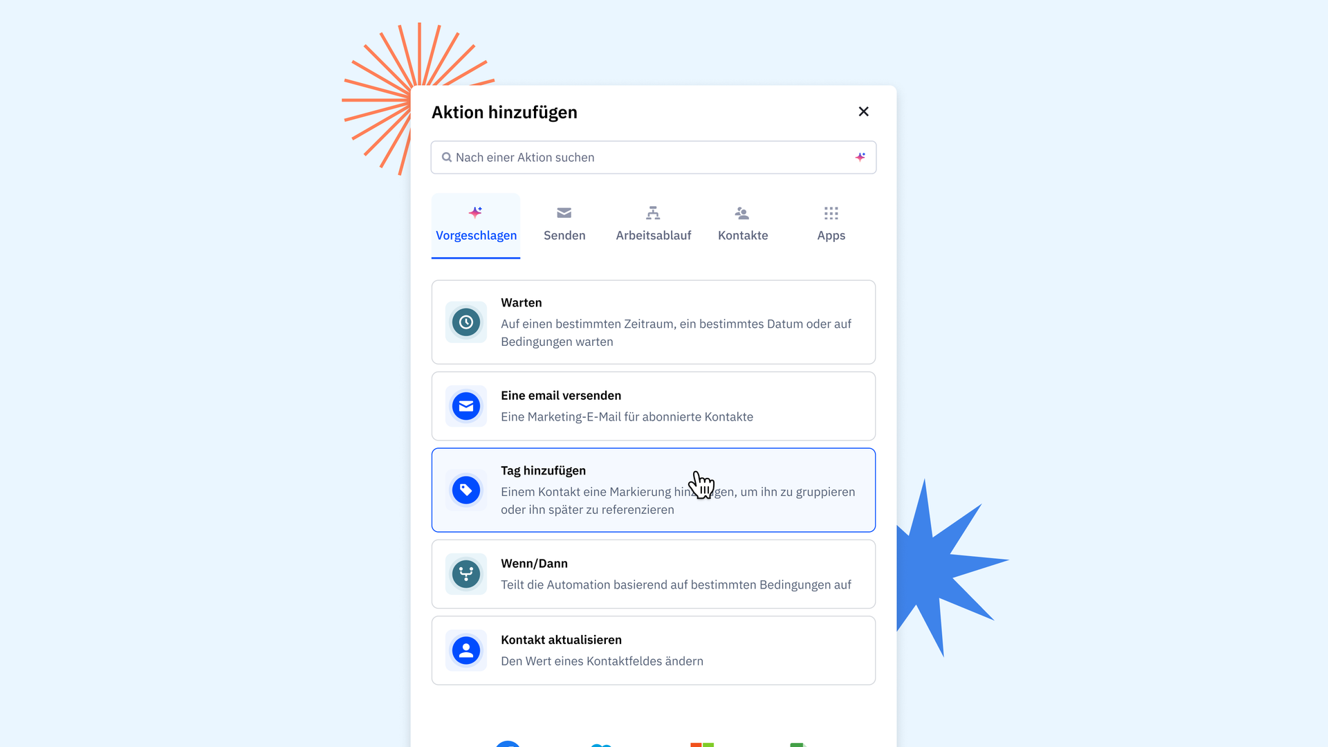 - Bessere Auffindbarkeit von Aktionen: Das aktualisierte Menü verbessert die Auffindbarkeit von Aktionen und erleichtert dir die Suche nach den richtigen Aktionen für deine Automation sowie die Auswahl ebendieser, unabhängig davon, ob du im Marketing erfahren oder erst eingestiegen bist.