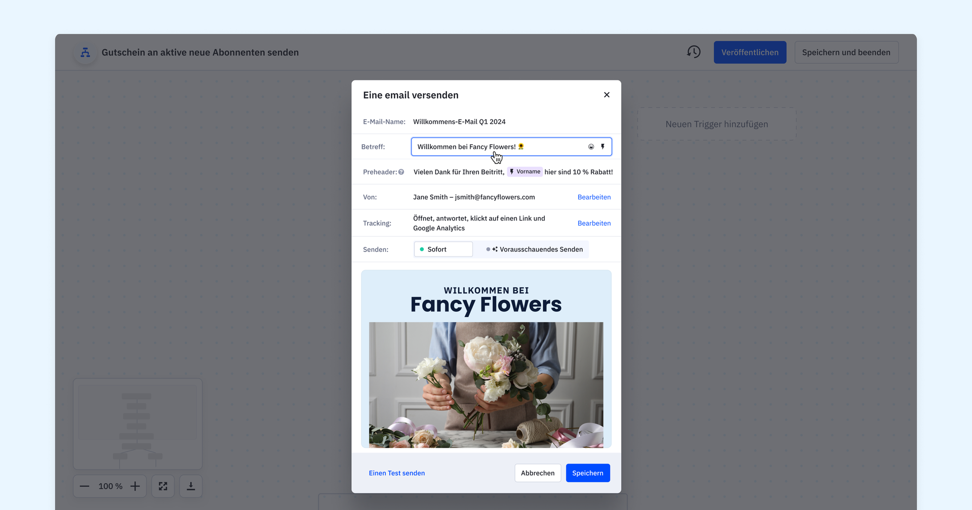 - Kontextbezogene Bearbeitung von Sendeaktionen: Wir aktualisieren unsere Sendeaktionen, sodass du sie direkt im Automation-Builder bearbeiten kannst, ohne deinen Workflow verlassen zu müssen. Durch diese kontextbezogene Bearbeitung wird dein Automation-Prozess für E-Mails, SMS-Nachrichten und interne Benachrichtigungen gestrafft, sodass du dich konzentrieren und deinen kreativen Fluss im Automation-Builder beibehalten kannst.