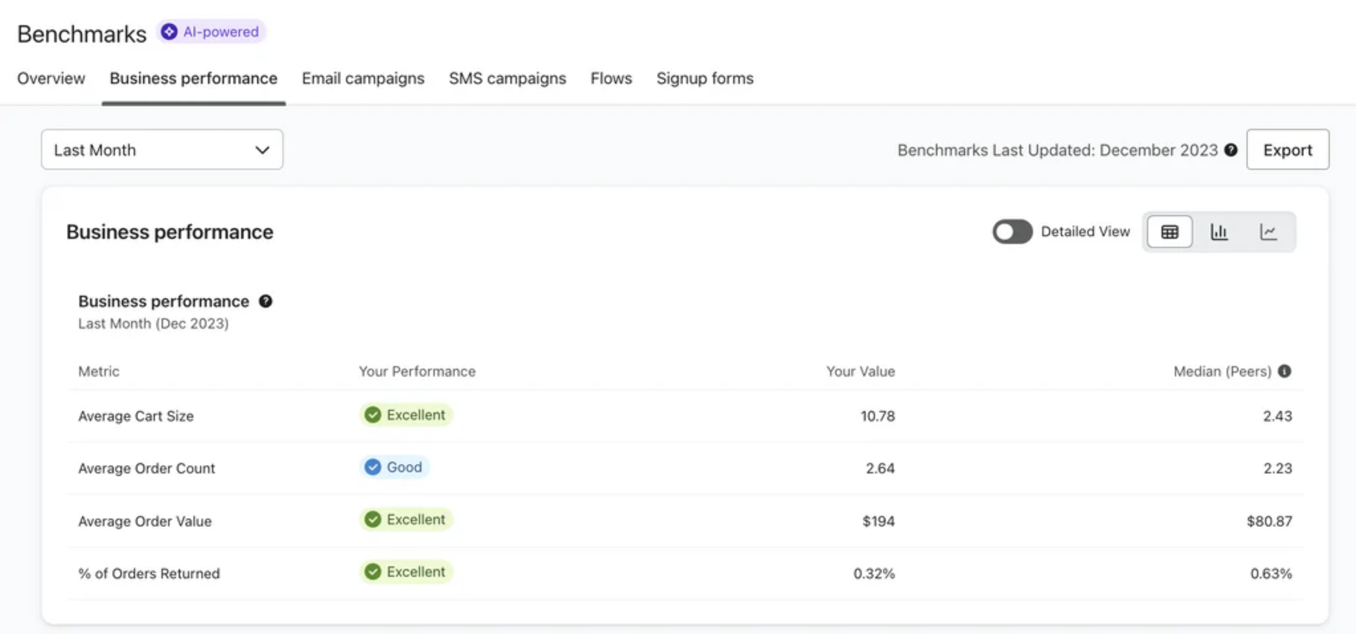 - Benchmark-Daten: Klaviyo bietet Benchmark-Daten an, um zu verfolgen, wie Sie im Vergleich zu Branchenstandards und Wettbewerbern abschneiden. Dies kann einen gewissen Kontext liefern, ist aber nur begrenzt aussagekräftig.