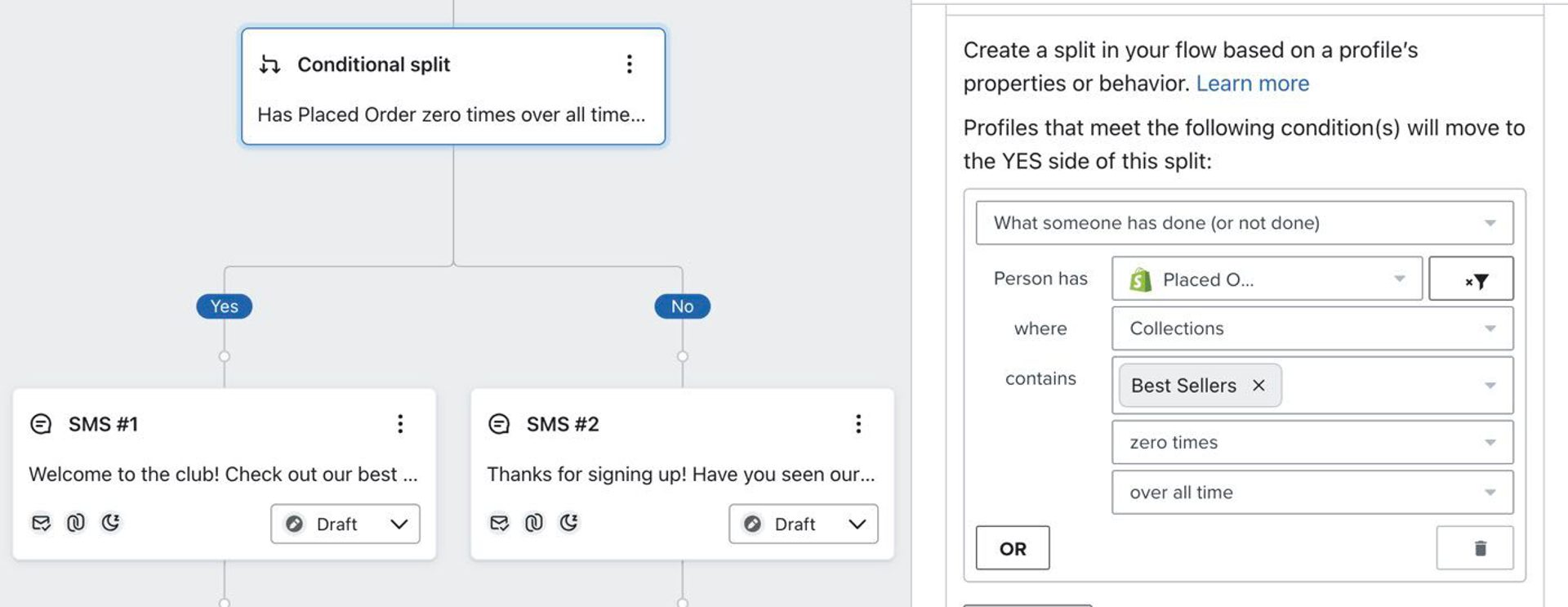 - Automatisierte Flows für SMS-Nachrichten: Mit Klaviyo können Sie automatisierte SMS-Flows einrichten, sodass Sie Nachrichten basierend auf Kundenaktionen oder Triggern senden können. So können Sie z. B. Follow-up-Nachrichten nach einem Kauf automatisieren oder Erinnerungen für abgebrochene Warenkörbe senden. Sie können auch einen Split-Test der SMS-Flows durchführen.
