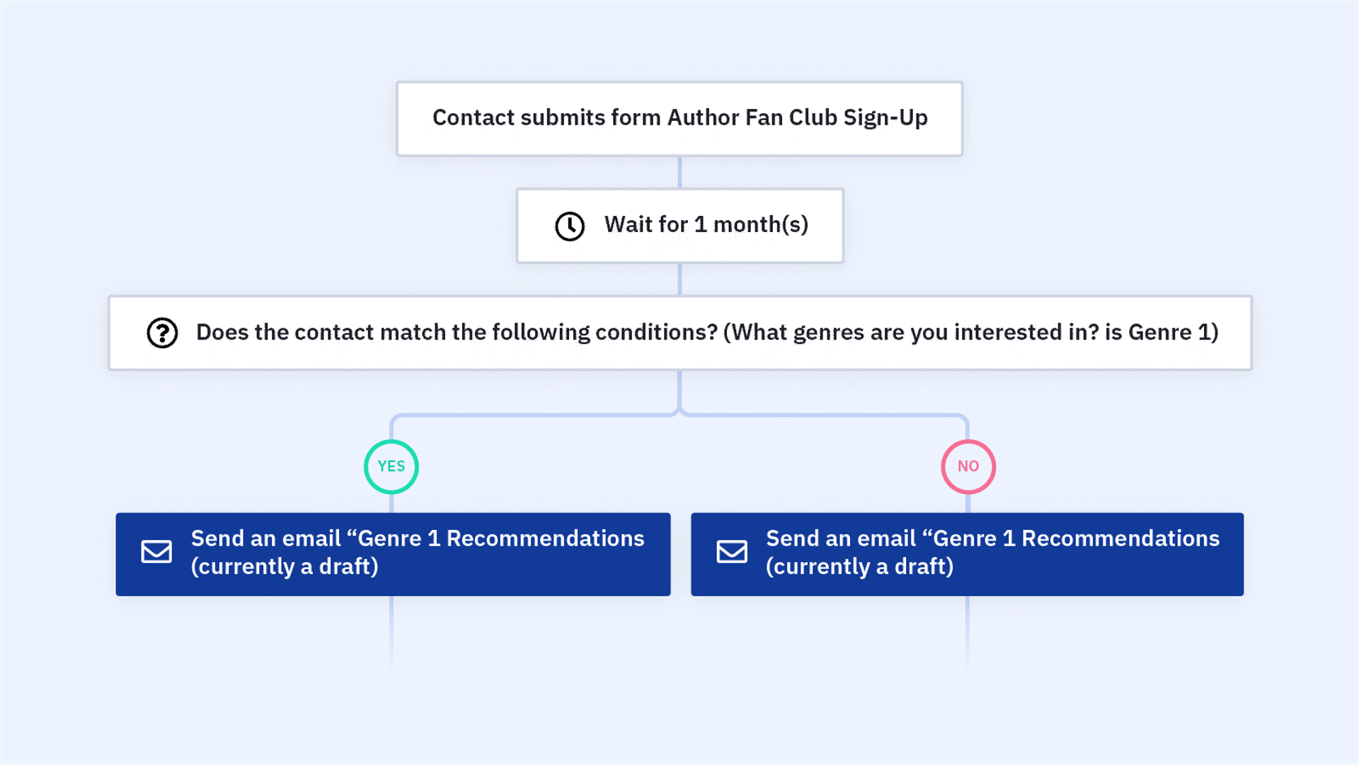 - Produktempfehlungen: ActiveCampaign kann Kunden auf der Grundlage ihres Surf- und Kaufverhaltens Produkte vorschlagen, was zu zusätzlichen Verkäufen führt und das Einkaufserlebnis verbessert. Diese Automation empfiehlt zum Beispiel Bücher auf der Grundlage der Genres, die ein Kontakt in einem zuvor gesendeten Formular ausgewählt hat.