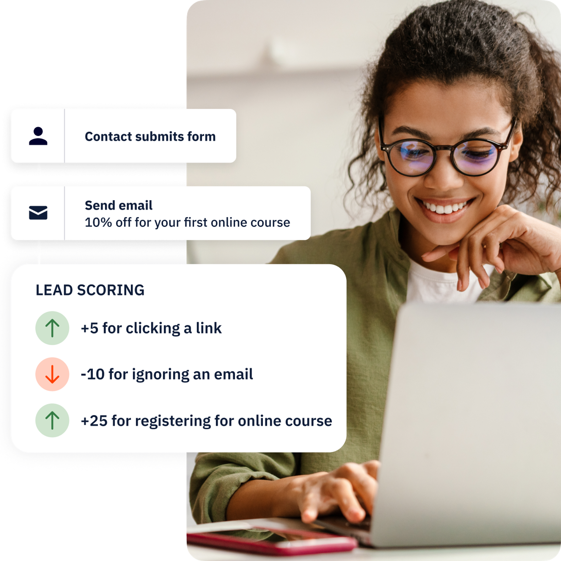 Erstellen Sie Zielgruppensegmente, die Ihnen dabei helfen, die Ziele jedes Lernenden zu verfolgen. Mit unseren Feldern, Tags und benutzerdefinierten Objekten können Sie sich ein detailliertes Bild von jedem Kontakt machen, von der Website über die Kursauswahl bis hin zu den Ergebnissen.
