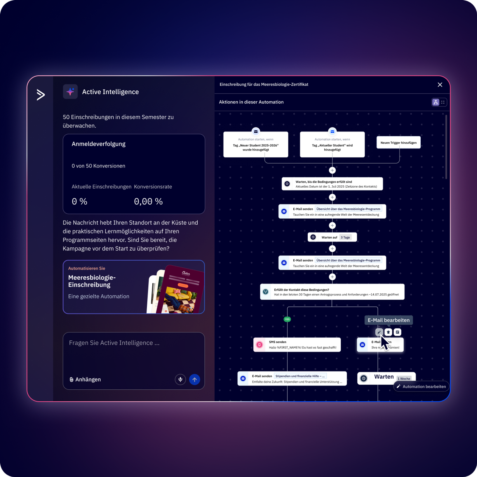Erstellen Sie mehrstufige Workflows mit bis zu 5 Triggern, unbegrenzten Aktionen und erweiterten bedingten Splits. Oder lassen Sie Active Intelligence diese für Sie erstellen, indem Sie Ihr Ziel beschreiben.
