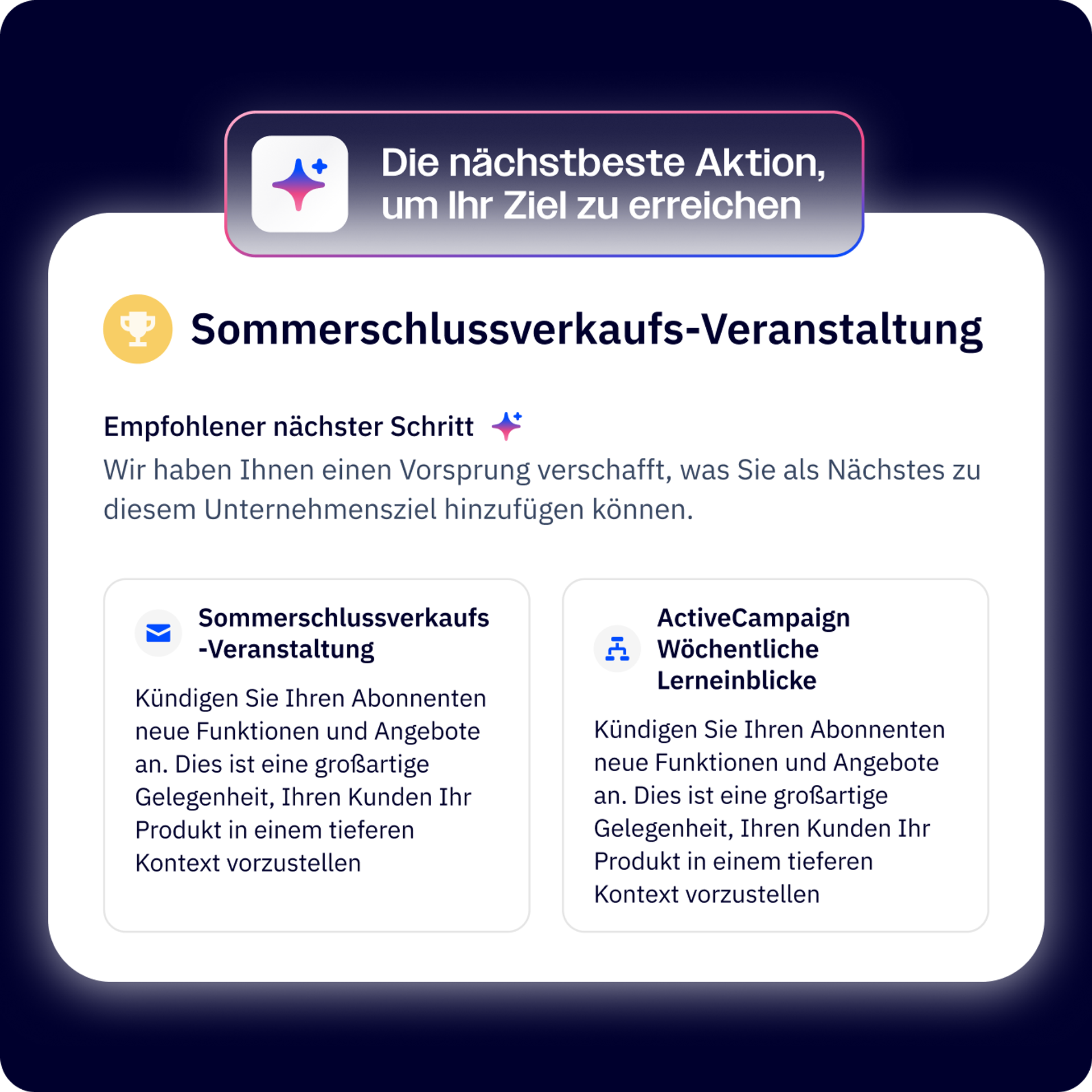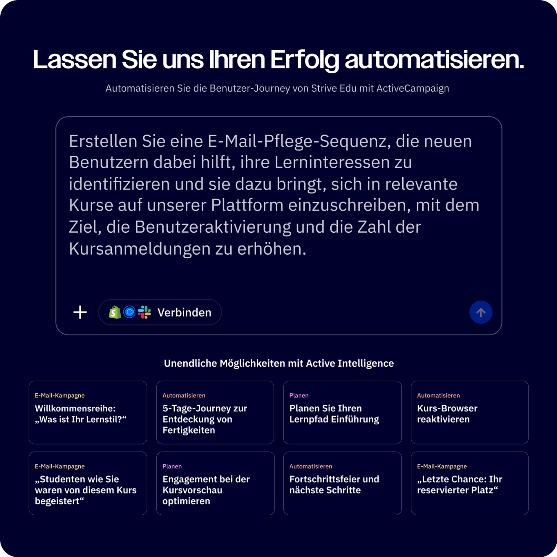 Active Intelligence führt Milliarden von Datenpunkten und speziell entwickelte KI-Agenten zusammen, um Ihre Ziele in vollständig umgesetzte Marketingstrategien für Sie zu verwandeln.