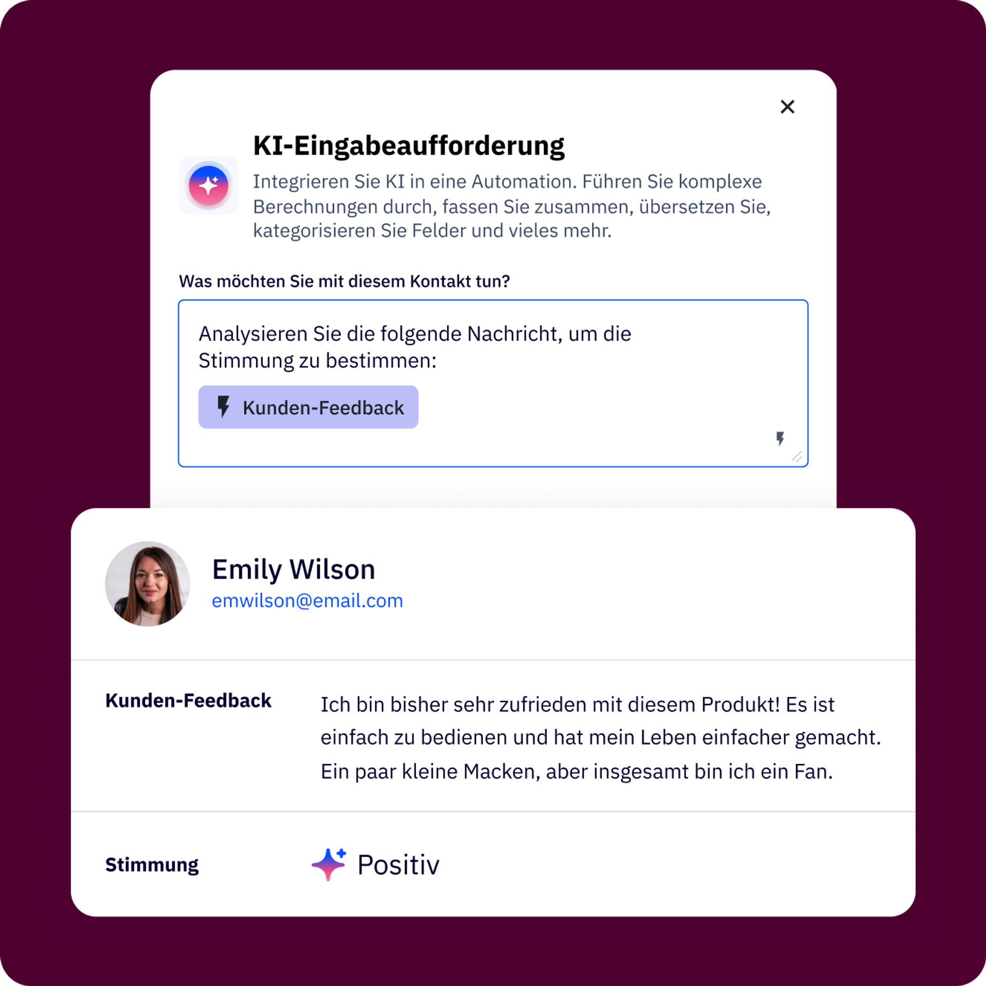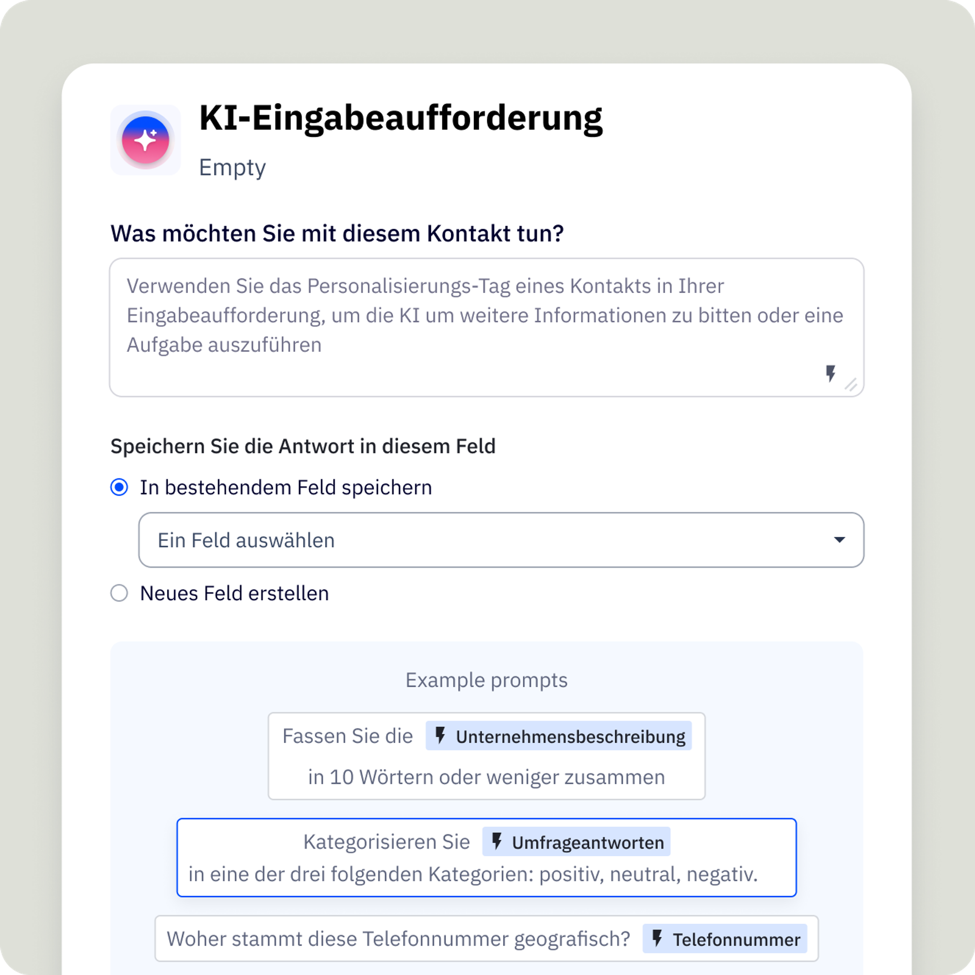 Orchestrieren Sie mit dem KI-Prompt-Block komplexe Aufgaben in einfacher, umgangssprachlicher Sprache. Schreiben Sie einfach Ihre Anweisungen und überlassen Sie der KI den schwierigen Teil.
