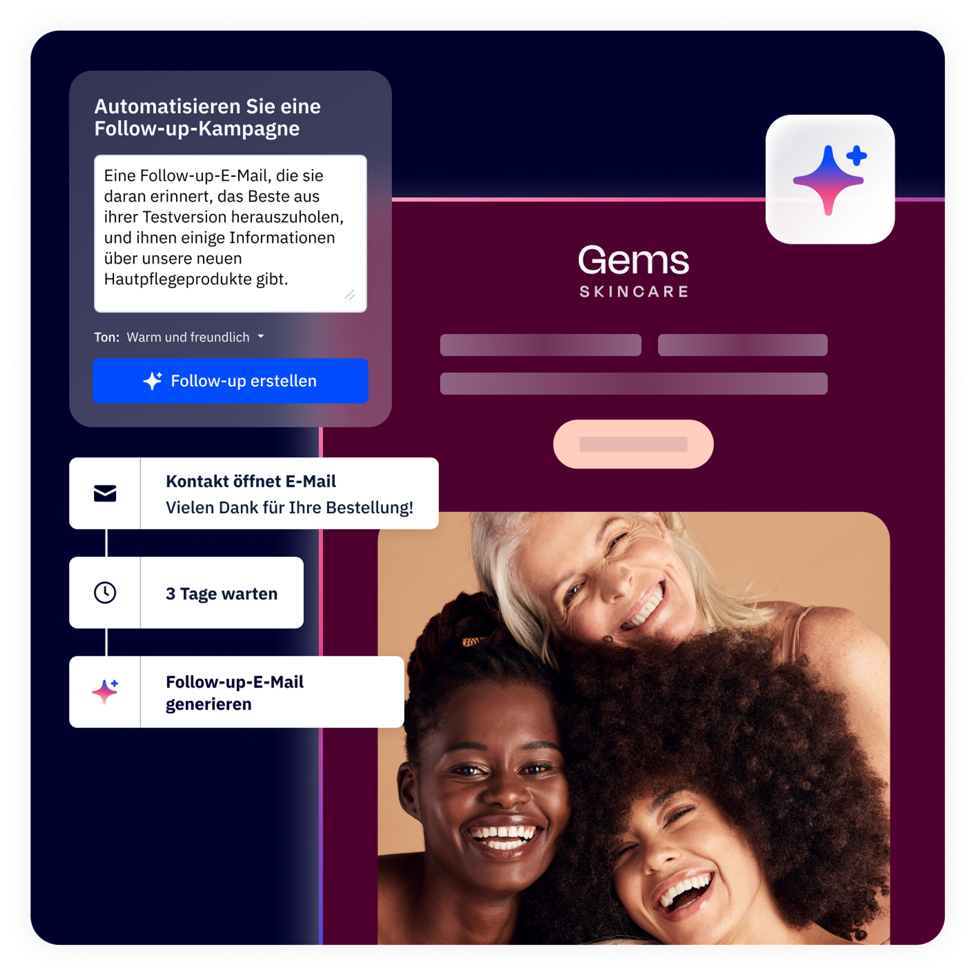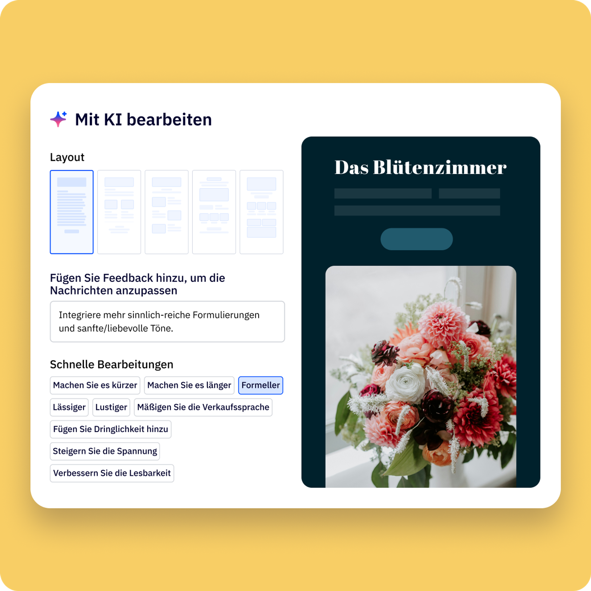 Weniger Überlegungen – mehr Vermarktung. Unser KI-Kampagnen-Builder greift Ihre Ideen auf und erstellt innerhalb weniger Minuten vollständig realisierte Kampagnen für Sie.