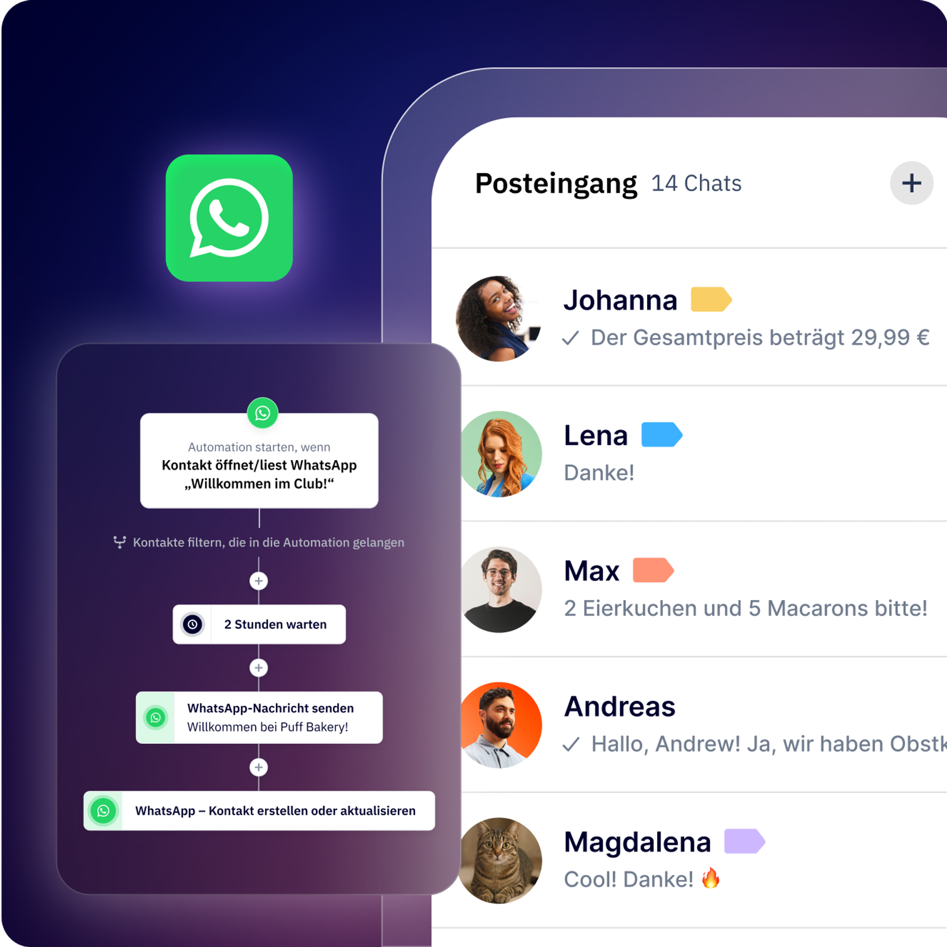 - Crosschannel-Koordination (E‑Mail, SMS, WhatsApp, soziale Netzwerke, Web usw.)