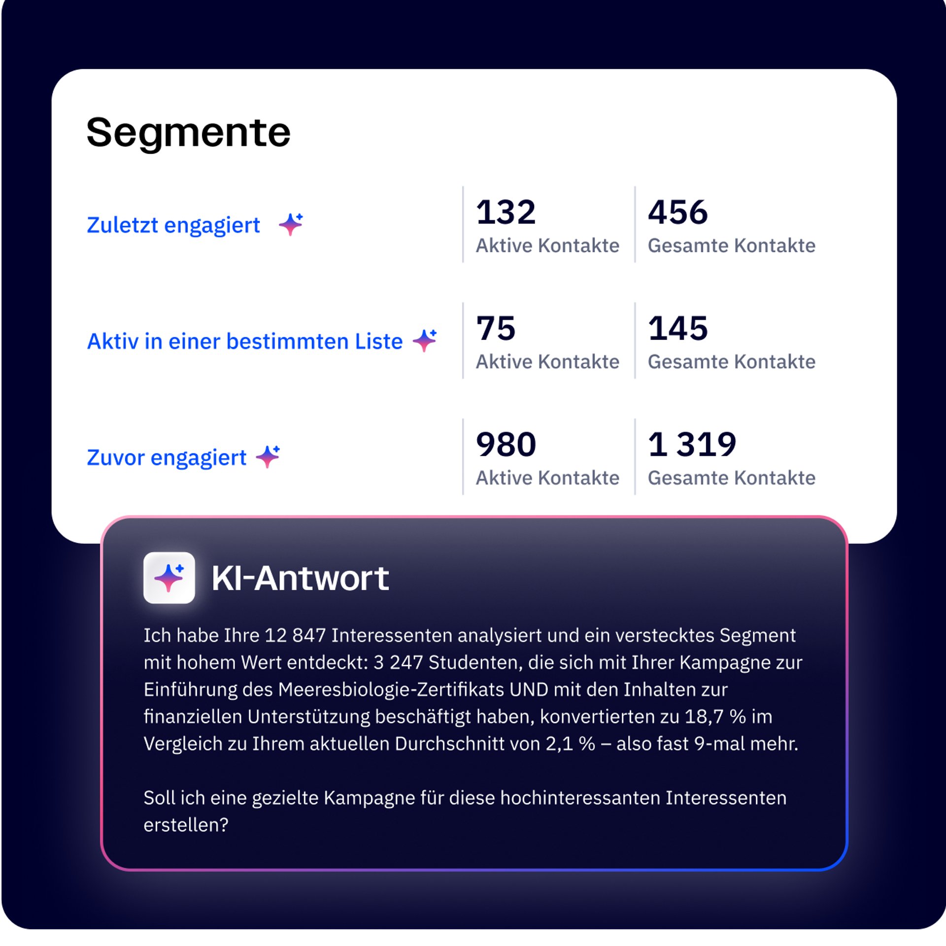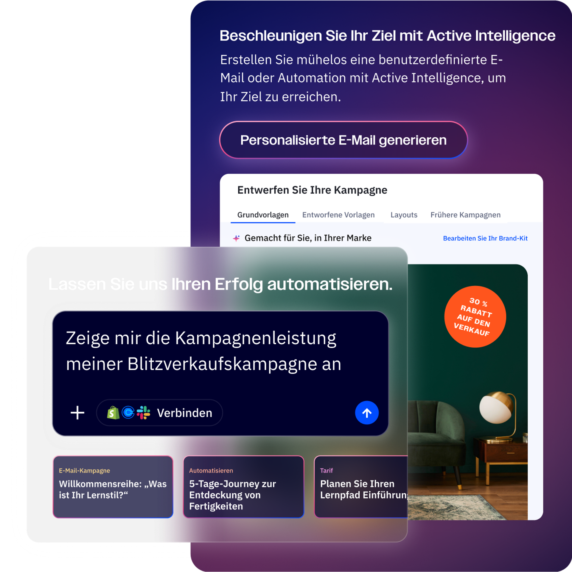 ActiveCampaign verarbeitet jede Woche Milliarden von Kundeninteraktionen. Dieser enorme Umfang gibt unserer KI einen beispiellosen Einblick in das, was in verschiedenen Branchen, Zielgruppen und Kanälen tatsächlich funktioniert. Mit anonymisierten Echtzeitdaten aus Millionen von Kampagnen verlässt sich Active Intelligence nie auf Vermutungen und stützt sich immer auf reale Experiences. Das ist der Vorteil, den nur unsere Plattform bieten kann.