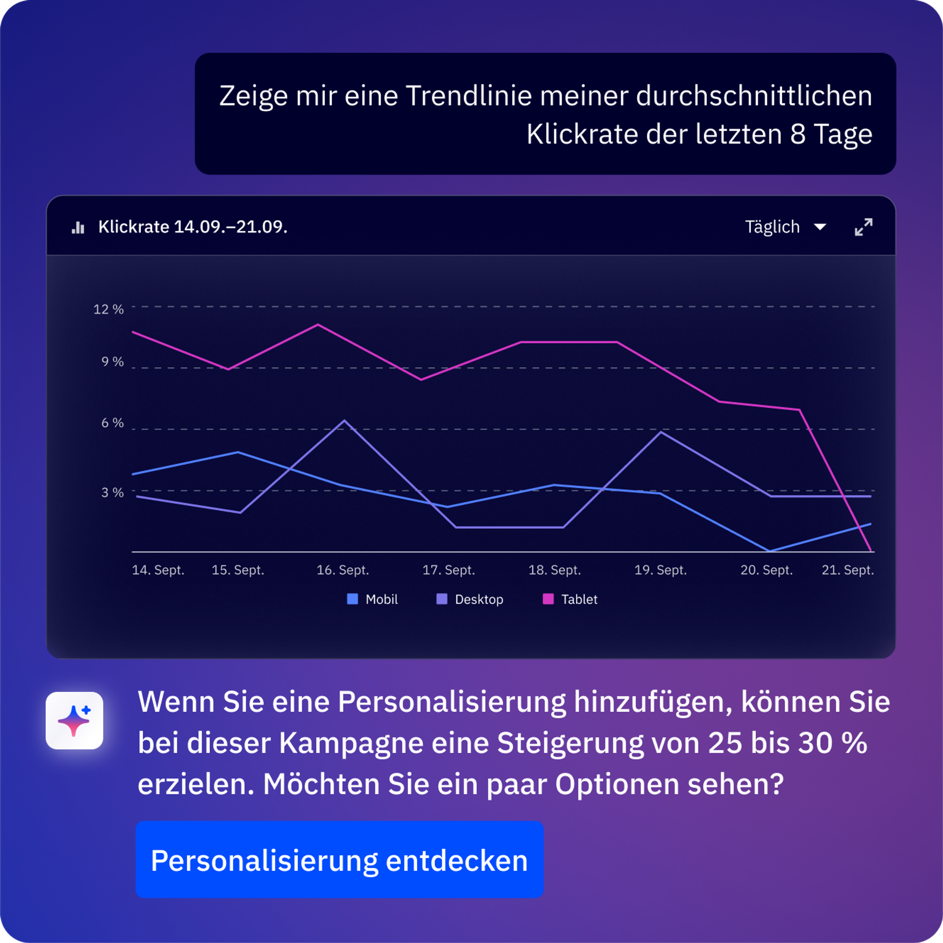 Ihr Unternehmensziel-Agent hört sich Ihr Ziel an und ordnet es bewährten Strategien zu. Von den Betreffzeilen bis zum Kanalmix – Ihre Kampagne beginnt mit einer von KI entwickelten Strategie.