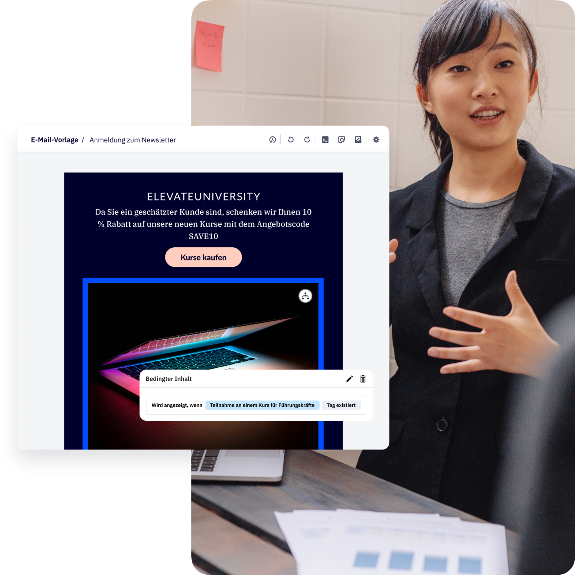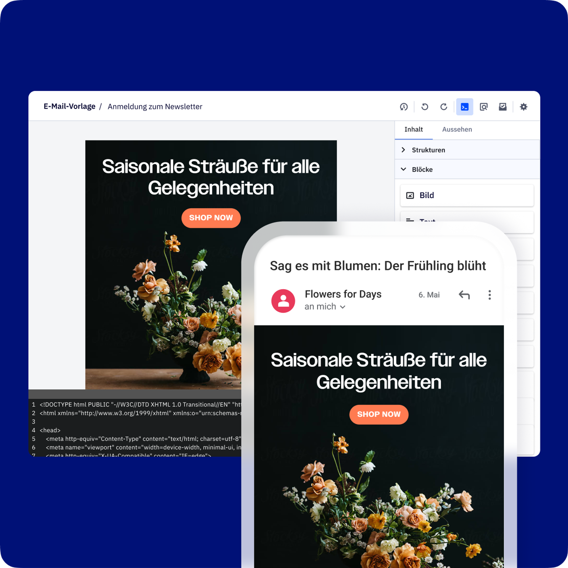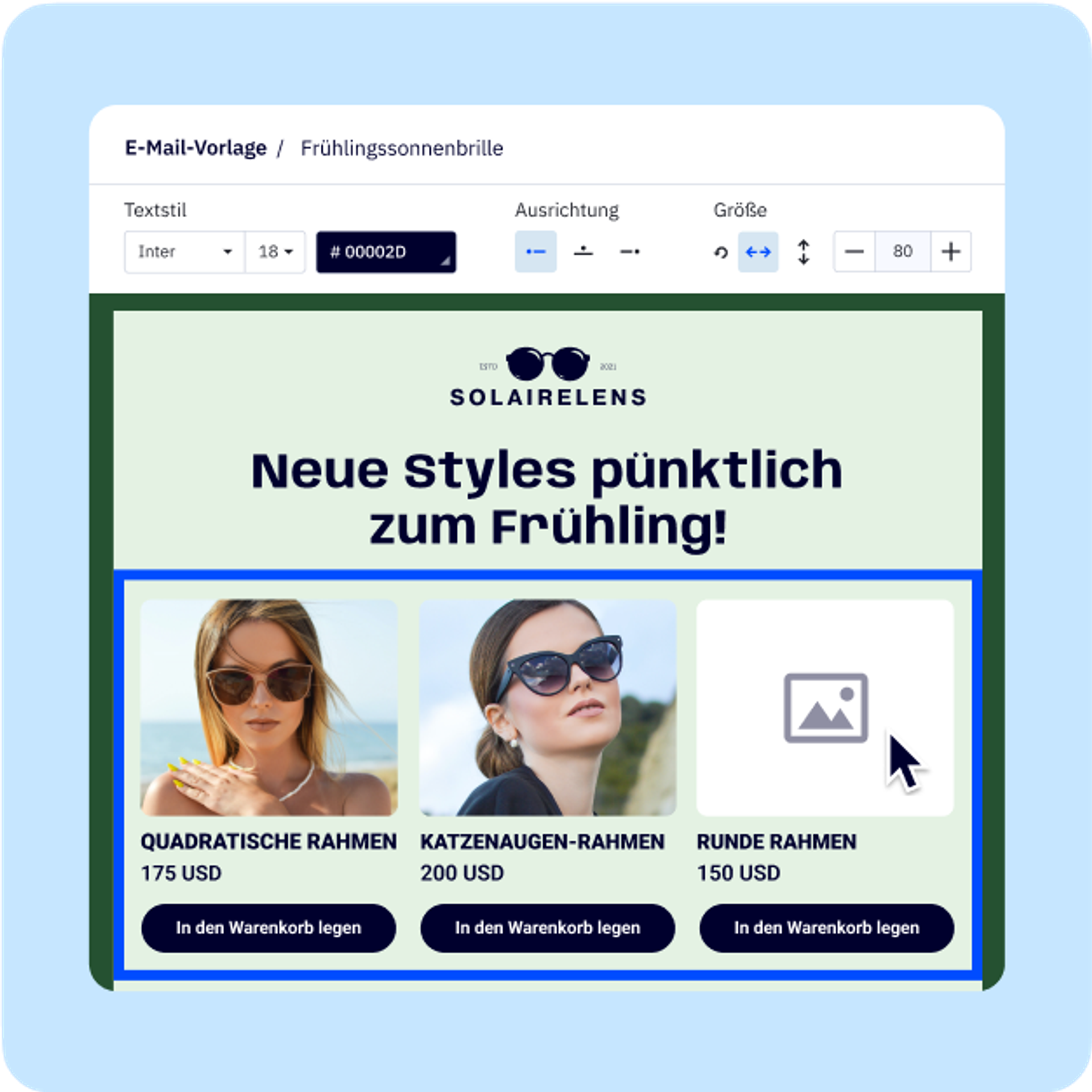 Stellen Sie sicher, dass jede von Ihnen versendete E-Mail Aufmerksamkeit erregt – und diese in Umsatz umwandelt. Mit unseren Design-Tools haben Sie die volle Kontrolle über Ihr Erscheinungsbild.