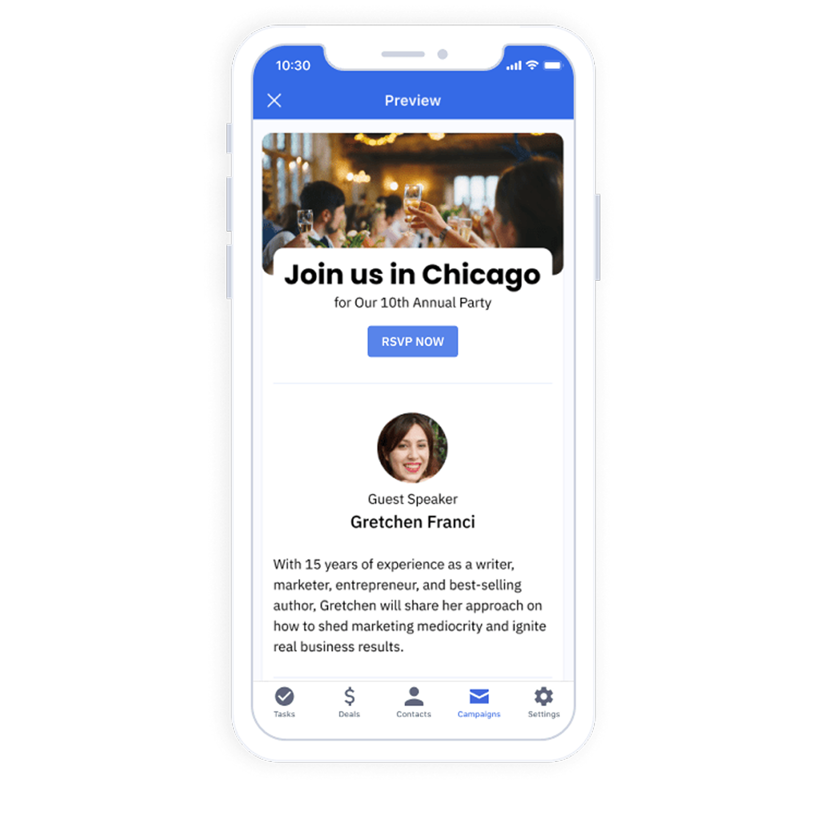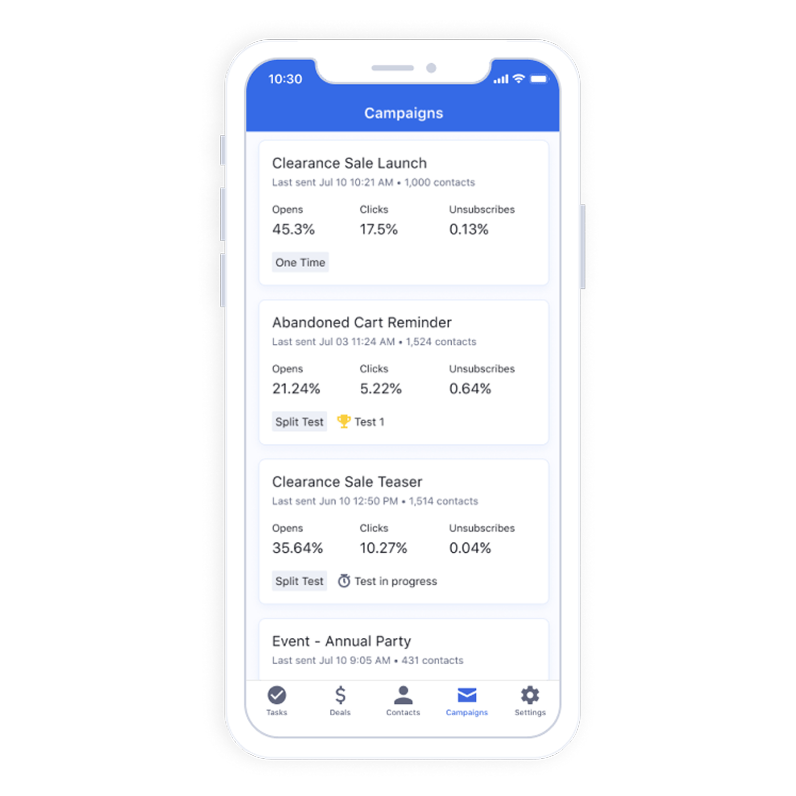 Wie wäre es, wenn Sie Ihr Geschäft vom Smartphone aus führen könnten? Mit der mobilen App von ActiveCampaign können Sie ganz einfach Ihre E-Mail-Berichte lesen, die Kundenaktivitäten verfolgen und Ihre CRM-Daten verwalten. Überall und jederzeit.