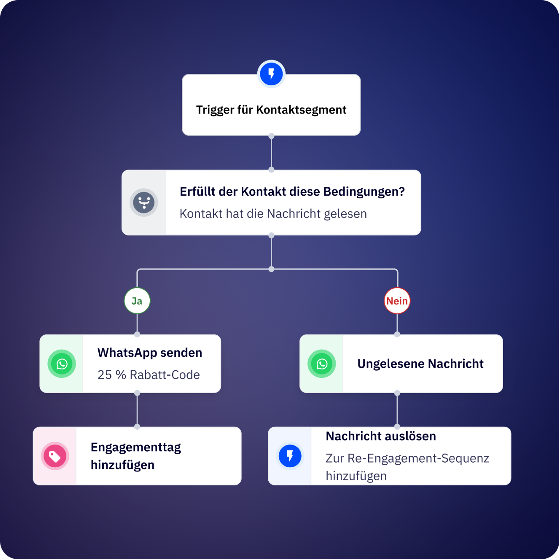 Ja. Mit bedingten Schritten kannst du deinen Flow auf der Grundlage von Kontaktvariablen, Flow-Variablen (Antworten aus vorherigen Schritten), globalen Variablen (Datum, Uhrzeit, Geschäftszeiten) oder Ausführungsvariablen verzweigen.
