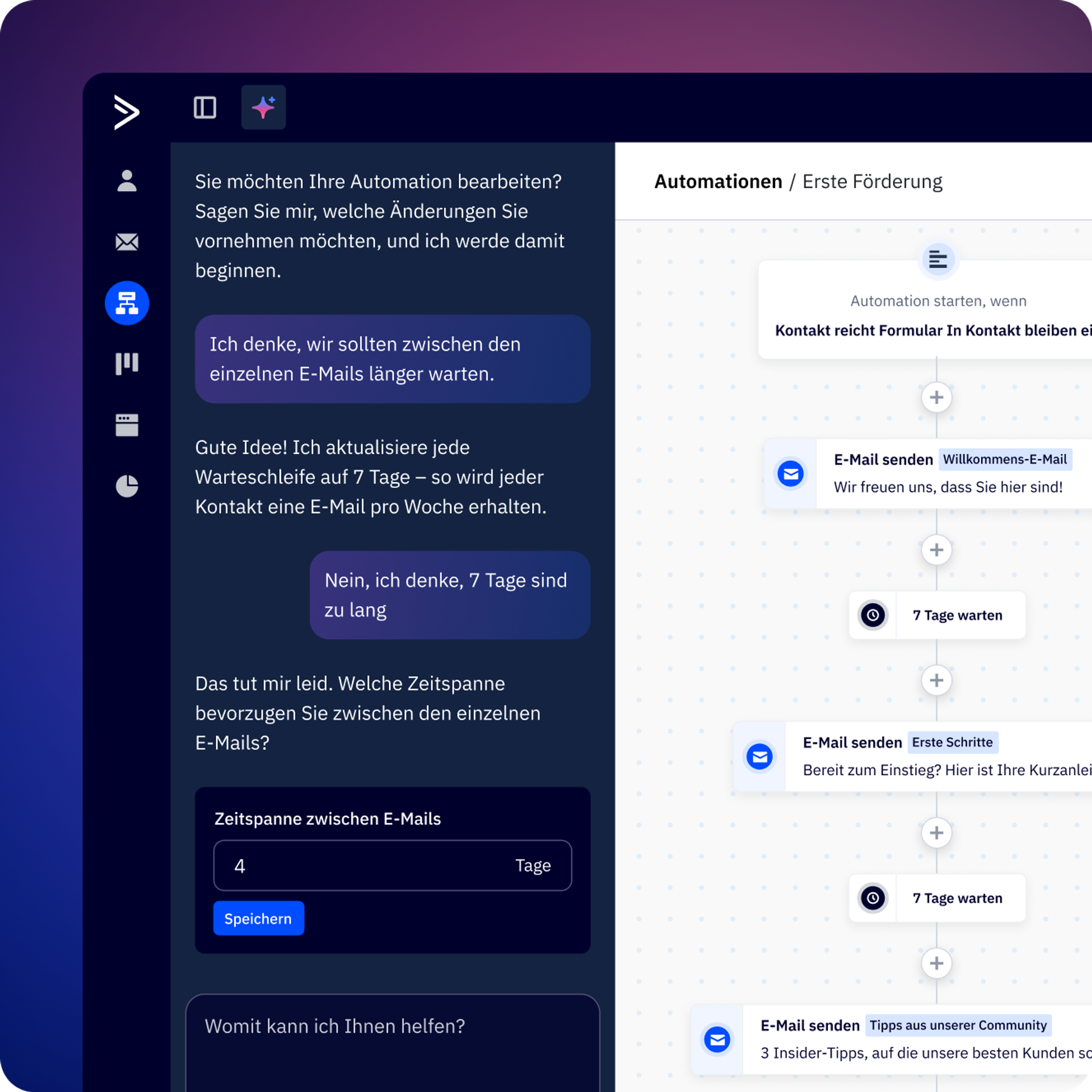 Die Active Intelligence-Seitenleiste wurde entwickelt, um mit Ihnen zusammenzuarbeiten. Sie kennt den gesamten Kontext Ihrer Arbeit: sei es die Analyse der Kampagnenleistung, die Erstellung von Automationen oder die Überprüfung von Berichten, und kann kontextbezogene Erkenntnisse und Empfehlungen liefern, ohne Ihren Flow zu unterbrechen.