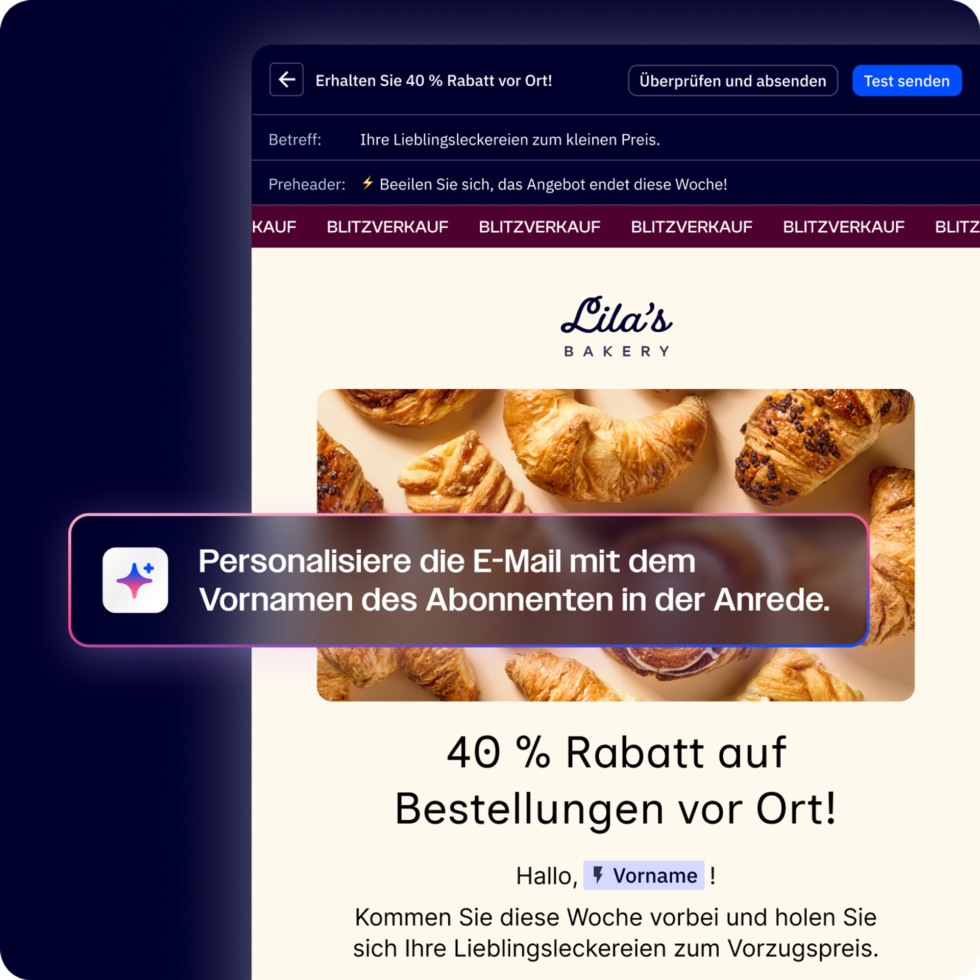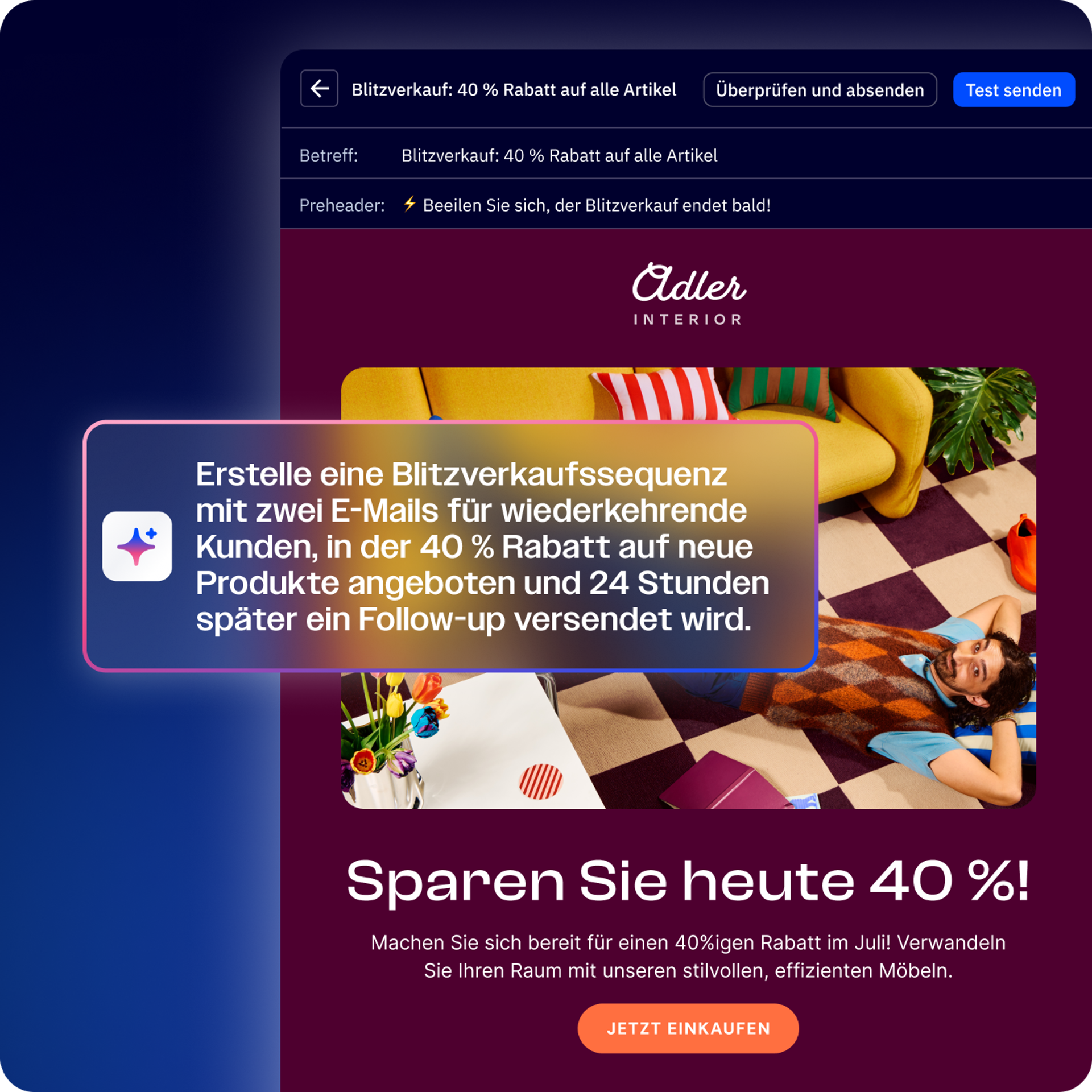 Erstellen und optimieren Sie eine komplette Kampagne mit Betreffzeilen, Texten, Bildern und vielem mehr – von einer einzigen Idee bis hin zu einer gestarteten Kampagne in Rekordzeit.
