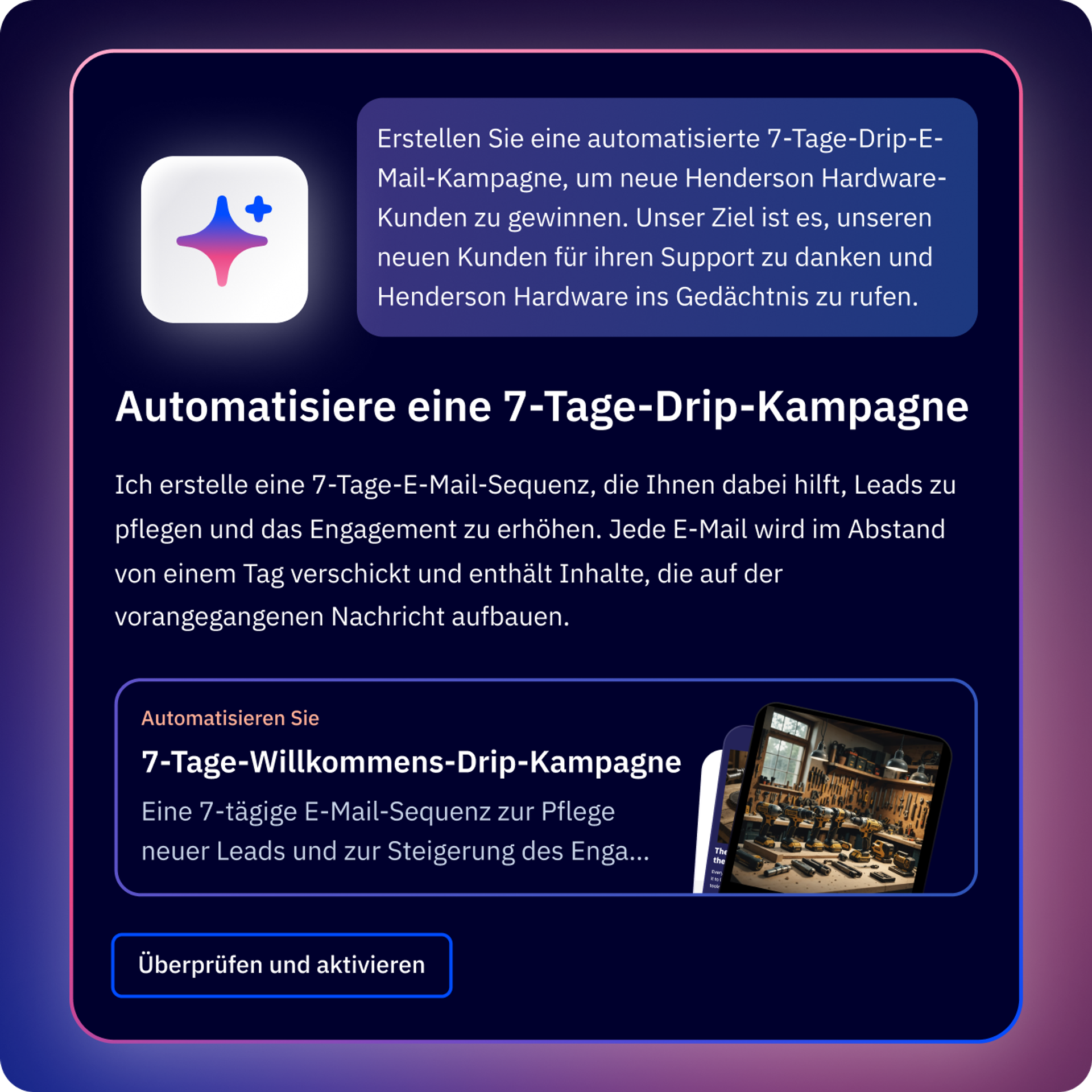 Generieren Sie sofort mehrstufige Nurture-Flows ohne komplexes Set-up. Beschreiben Sie einfach Ihr Ziel, um maßgeschneiderte Automationsvorschläge zu erhalten. Sehen Sie zu, wie Active Intelligence sofort die gesamte Customer Journey und den Inhalt für Sie erstellt, um Kunden mühelos vom Interesse zur Aktion zu führen.