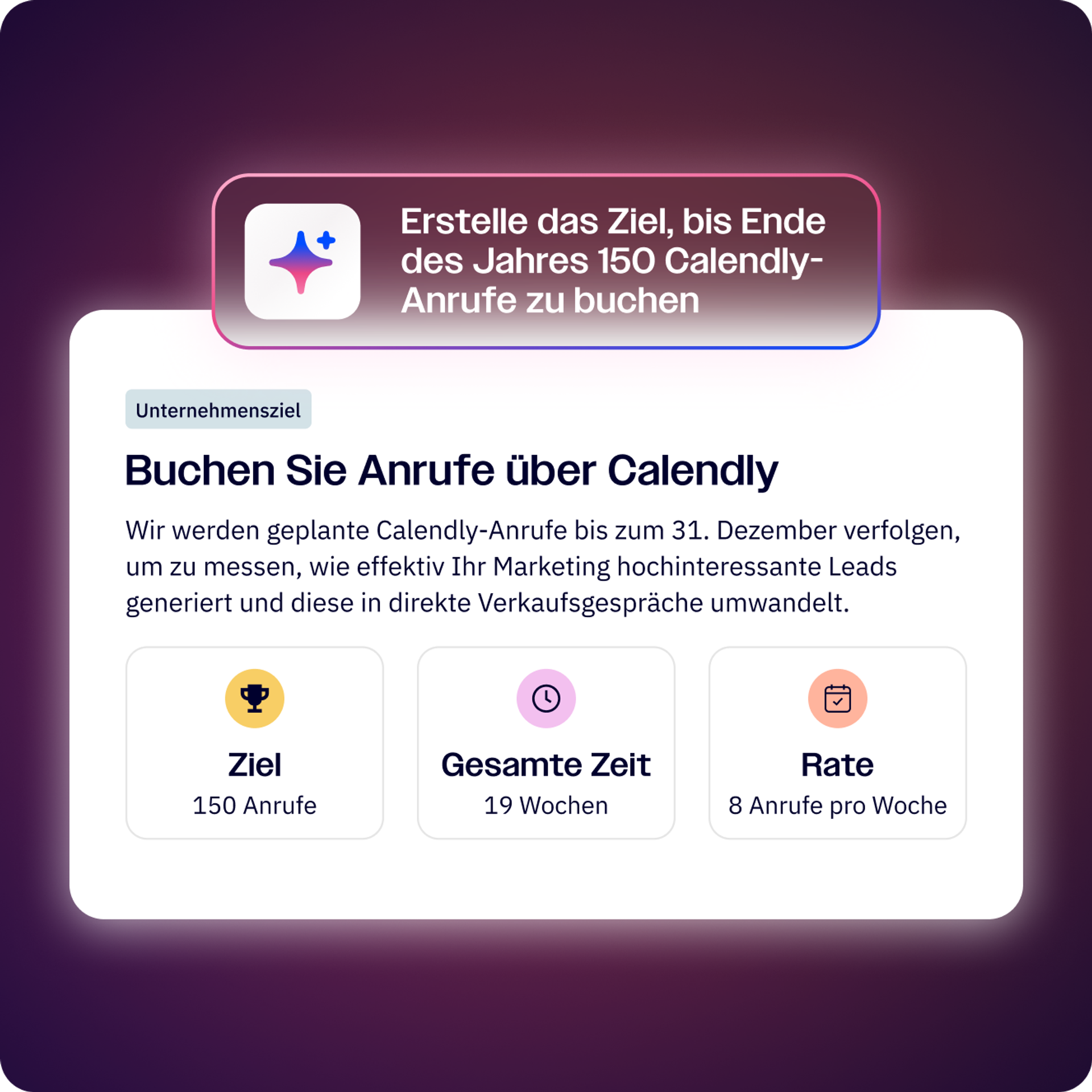 Verwandeln Sie „was wäre wenn“ in „was kommt als Nächstes“. Beschreiben Sie Ihr Ziel in einer Eingabeaufforderung, um Ihr messbares Unternehmensziel zu erstellen. Beobachten Sie, wie Active Intelligence Gespräche und Assets einrichtet, um Ihren Weg zum Erfolg zu ebnen.