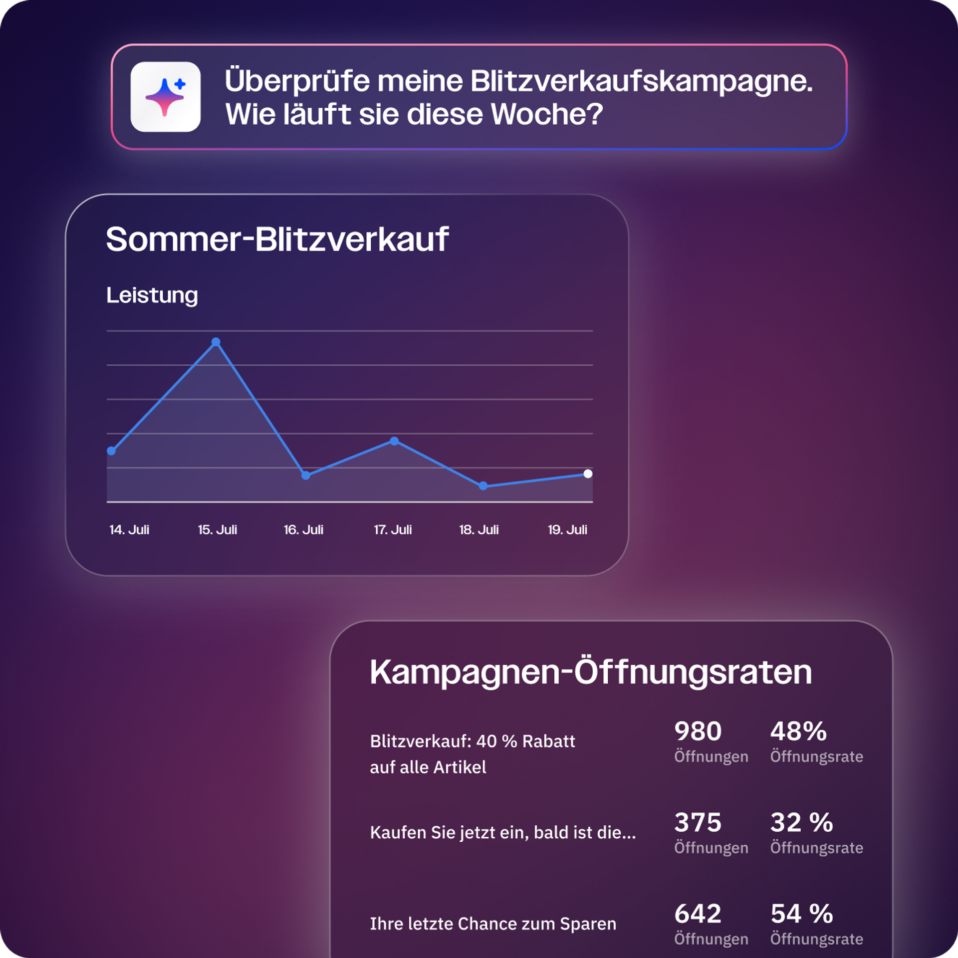 Fragen Sie nach Ihrer Marketingleistung und erhalten Sie sofortige Einblicke und Feedback, wie Sie sich verbessern können. Möchten Sie wissen, wie Ihre Öffnungsraten im Vergleich zu den Branchenstandards im Einzelhandel sind oder welche inhaltlichen Änderungen Sie vornehmen können, um Ihre jüngste E-Mail-Kampagne zu verbessern? Fragen Sie einfach danach.
