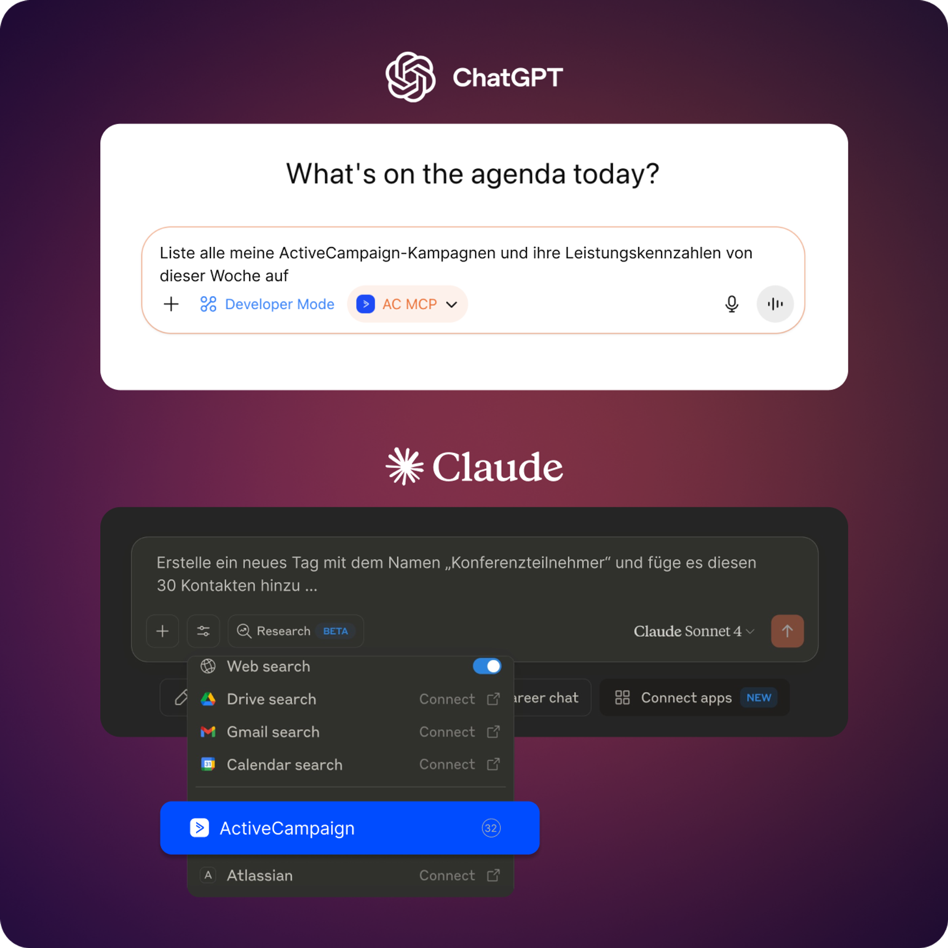 Verbinden Sie KI-Tools wie Claude und ChatGPT Desktop mit Ihrem ActiveCampaign-Konto. Verwalten Sie Kontakte, analysieren Sie Kampagnen und automatisieren Sie Aufgaben durch einfache Gespräche, ohne dass Sie programmieren oder die Registerkarte wechseln müssen.