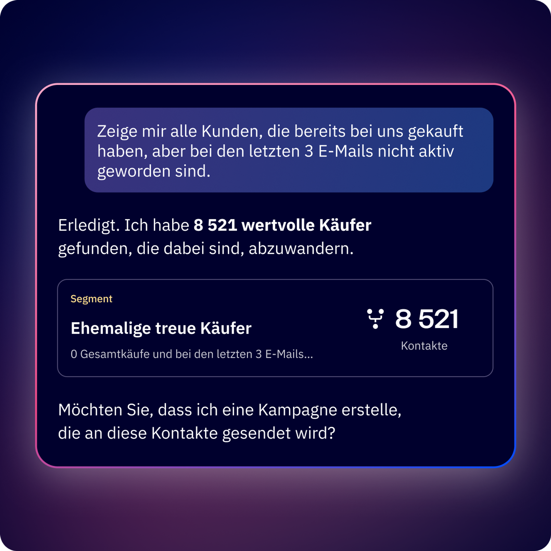 Verwandeln Sie Ihre ideale Zielgruppe mit einer einzigen Eingabeaufforderung in präzise Segmente. Erstellen Sie gezielte Gruppen, um neue Kunden zu gewinnen oder alte zurückzugewinnen, und setzen Sie Kampagnen um, die Ihre Ziele erreichen.
