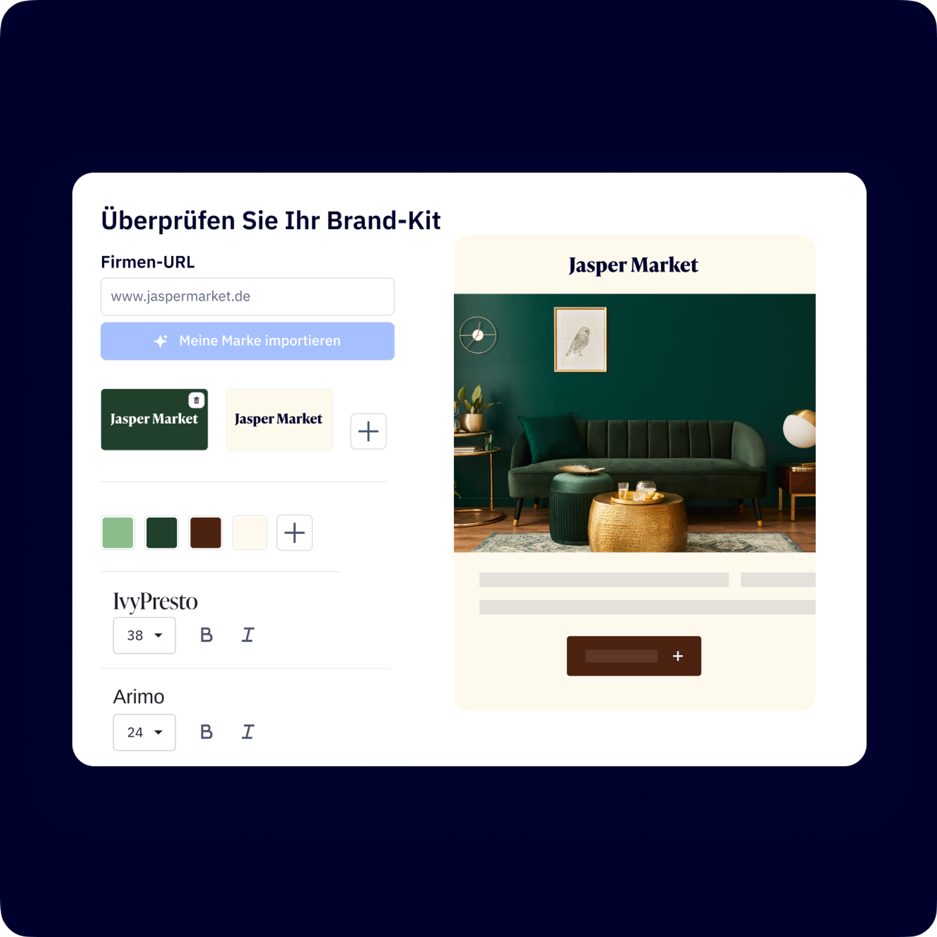 Mit unserem Importagenten für Brand-Kits dauert es nur wenige Sekunden, um alle Schriftarten und Farben Ihrer Kunden in ActiveCampaign zu importieren und mit der Erstellung von E‑Mails zu beginnen.