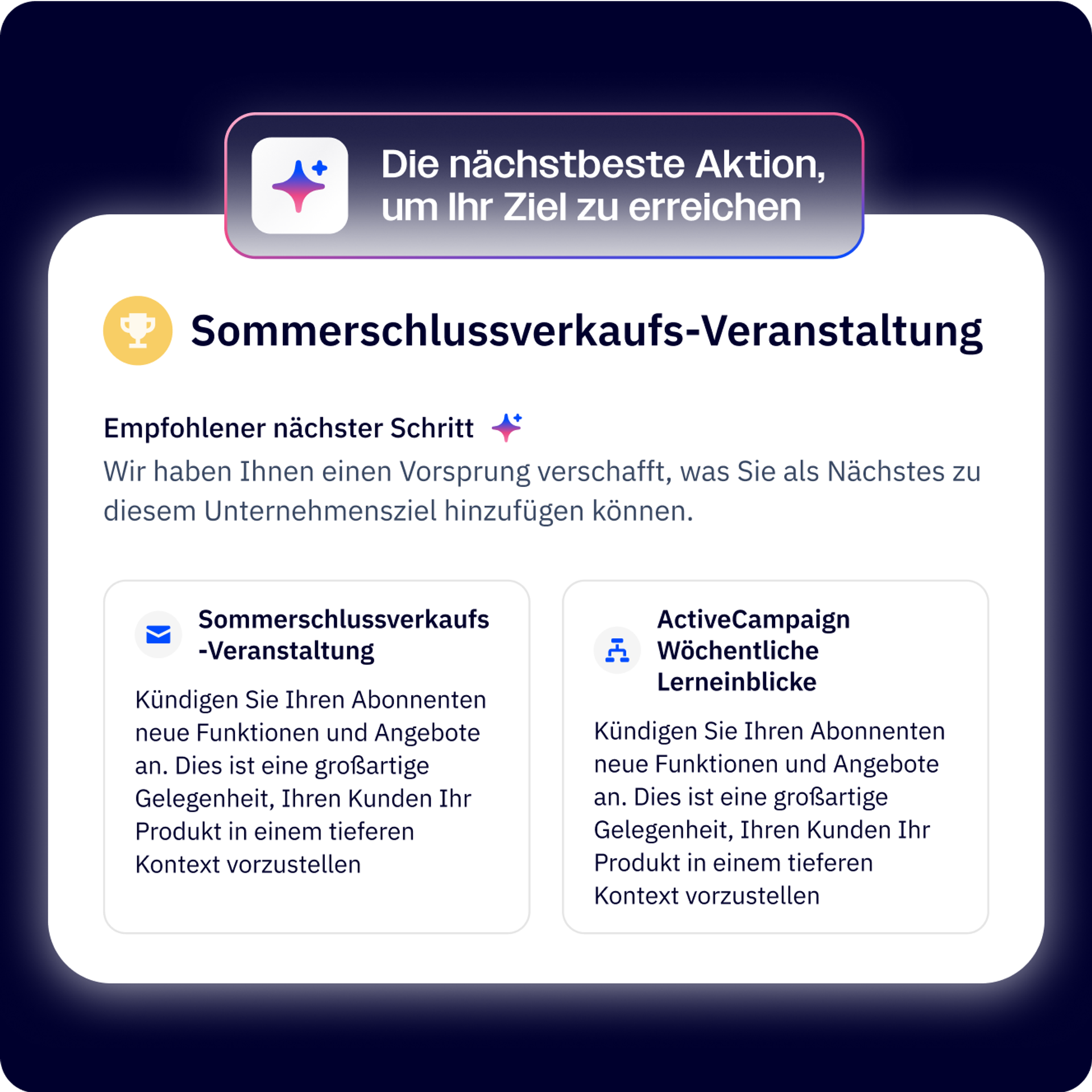 Hören Sie auf, sich darum zu bemühen, Daten in Aktionen umzusetzen. Unternehmensziele bieten Ihnen KI-gestützte Empfehlungen und ein einheitliches Dashboard, das klar zeigt, was funktioniert und was als Nächstes zu tun ist.