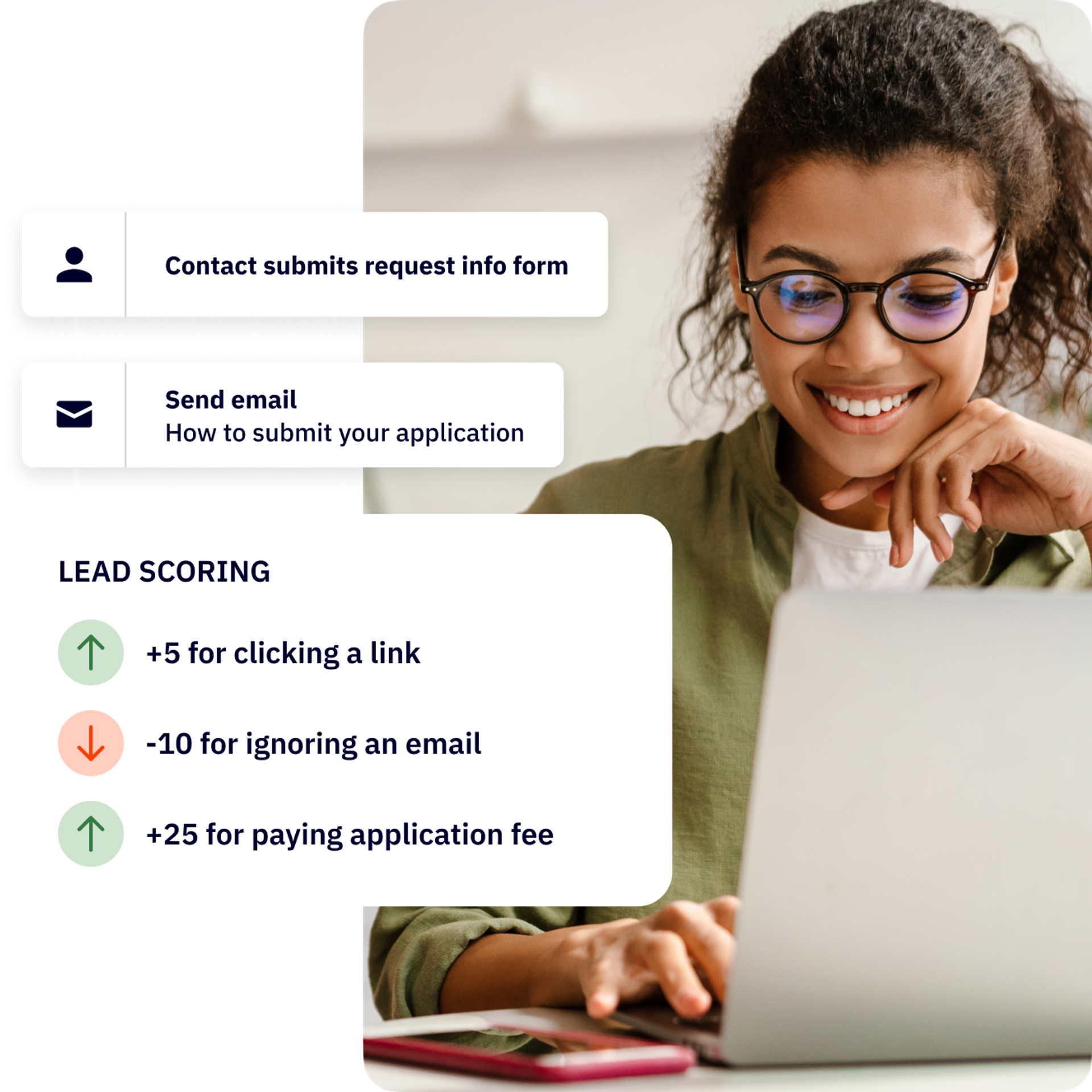 Give every contact a point-based score that shows their suitability for your program. Our lead scoring feature factors in their engagement, preferences, and more.