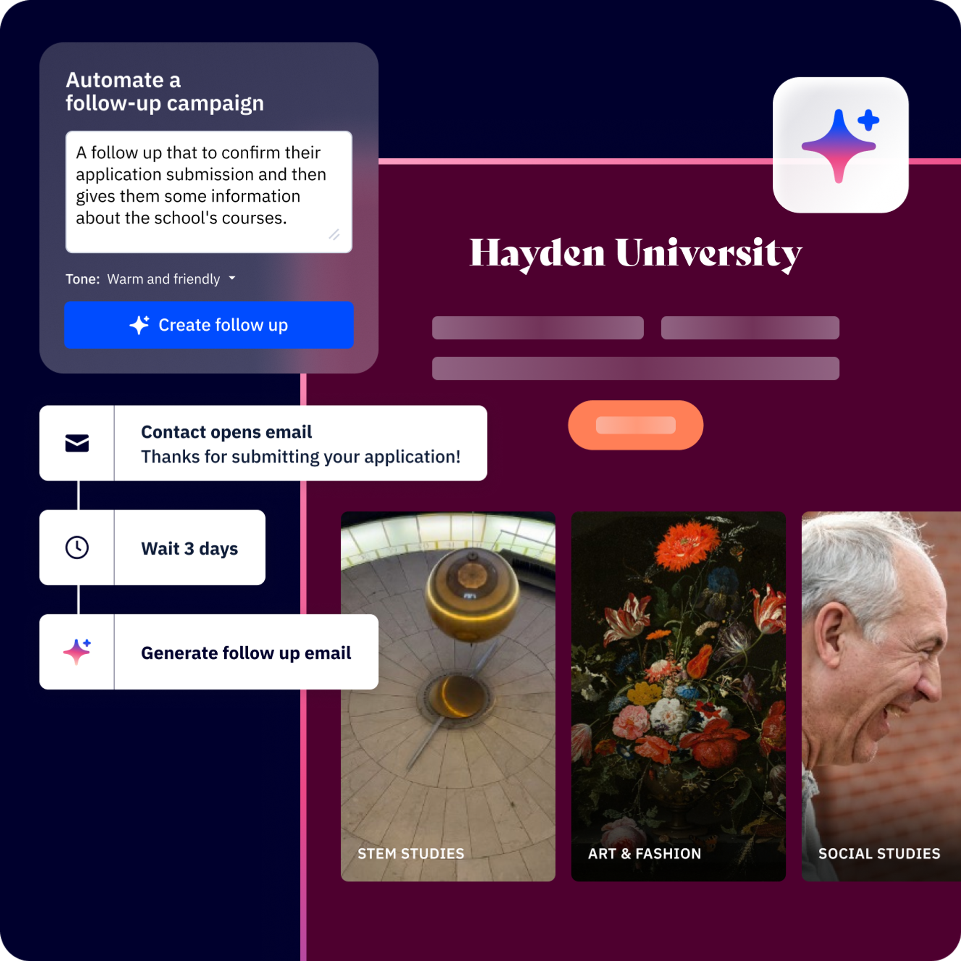Showcase your classes, campus, and extracurriculars. Send beautiful emails that help prospective students picture what it’s like to attend your school.