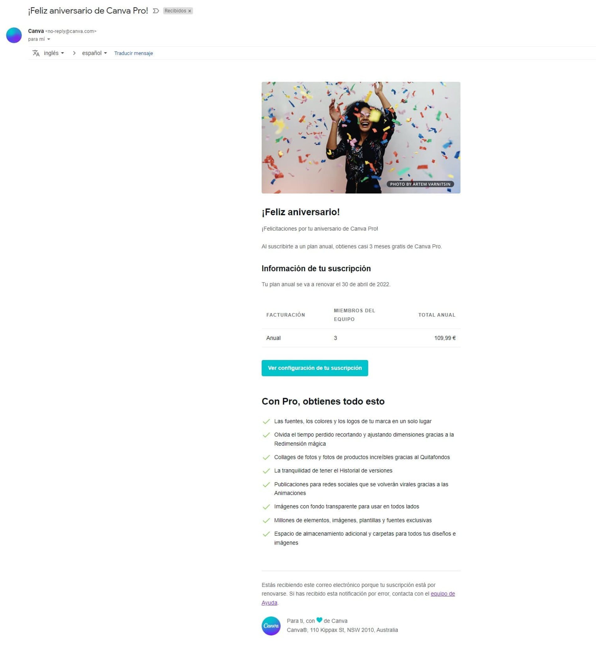 En este ejemplo de Canva vemos una forma original de informar sobre la renovación de su servicio, ya que se centra en celebrar el aniversario de esa persona como usuaria de Canva Pro. ¿El resultado? La suscripción se ve de una forma positiva e informal, no solo como un aviso de que se cobrará X precio por ese servicio.