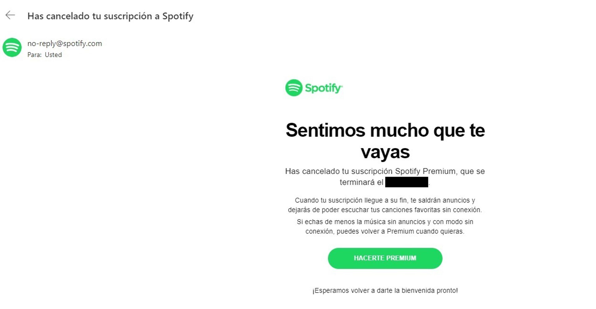 Spotify, por ejemplo, utiliza este tipo de mensajes («Sentimos mucho que te vayas», «puedes volver cuando quieras», «esperamos volver a darte la bienvenida pronto») para apelar a la emoción de sus usuarios e incluye una llamada a la acción para lograr que la persona se vuelva a suscribir.