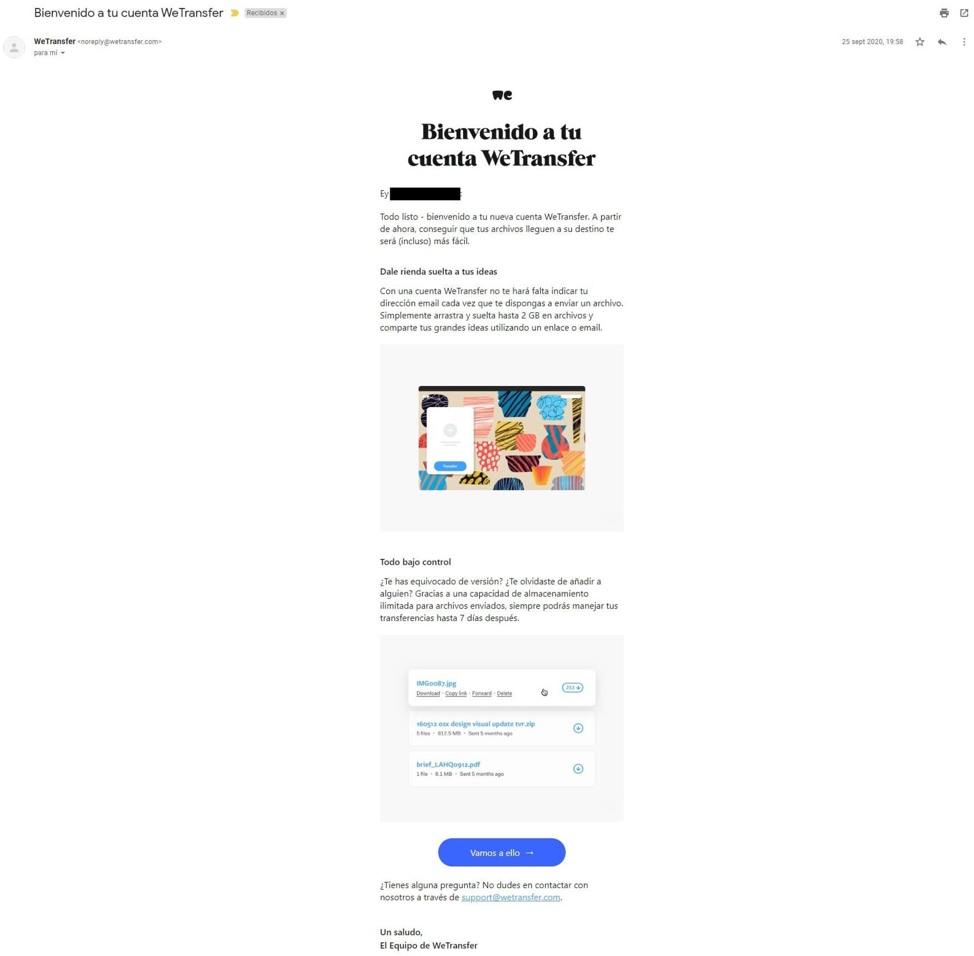 Este mensaje de bienvenida de WeTransfer es un buen ejemplo de este tipo de emails. Está personalizado, pues en el saludo incluye el nombre de pila del receptor, lo que inspira cercanía. Además, brinda contenido informativo sobre la plataforma, destaca las ventajas del registro y ofrece una forma de contactar con ellos en caso de duda.