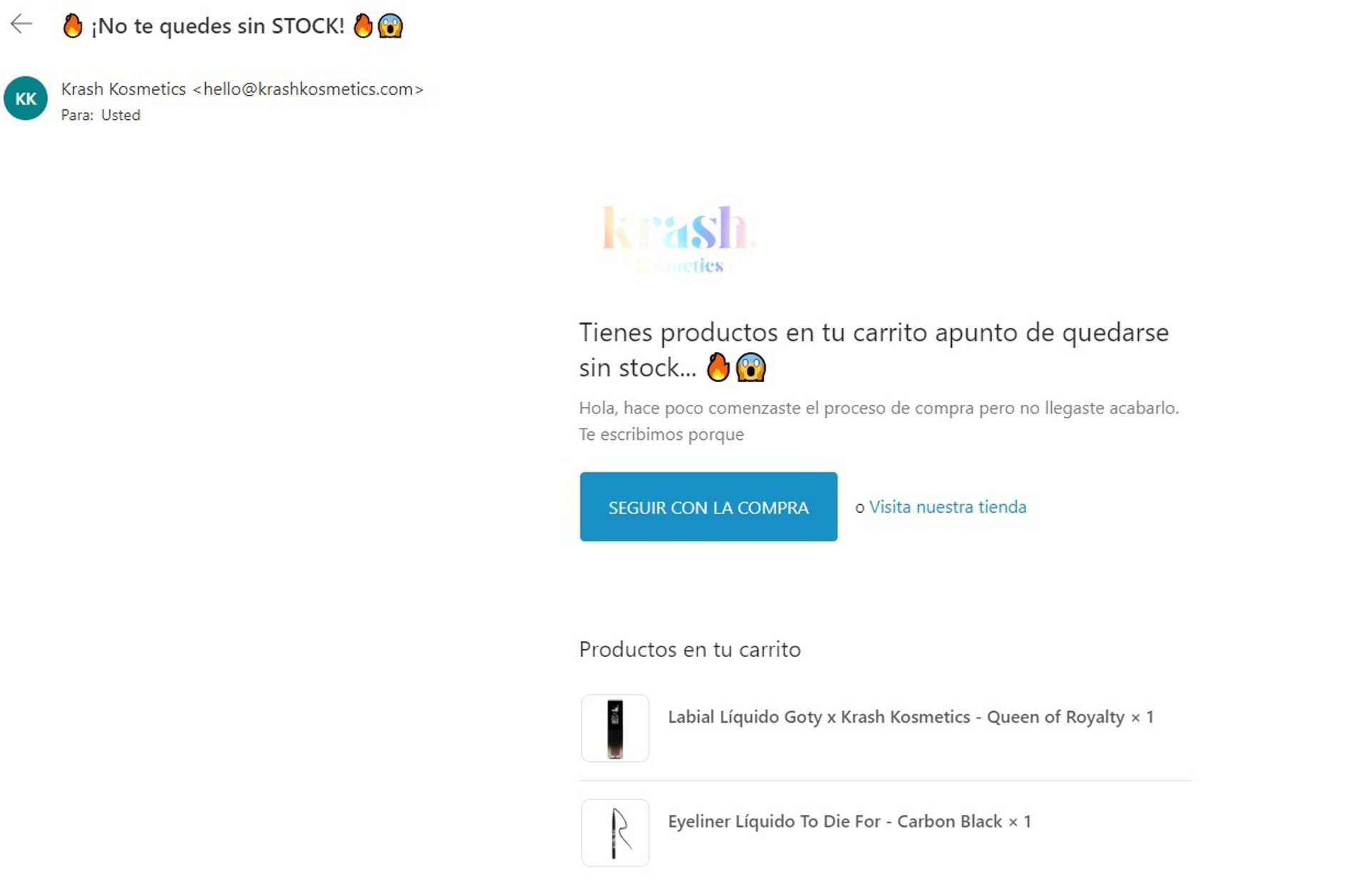 En este ejemplo de Krash Kosmetics puedes ver cómo, con un asunto y un título llamativo, se puede despertar ese temor a perderse algo. Además, tal como hacen en este caso, mostrar los productos olvidados en el carrito puede motivar a la persona a retomar la compra.
