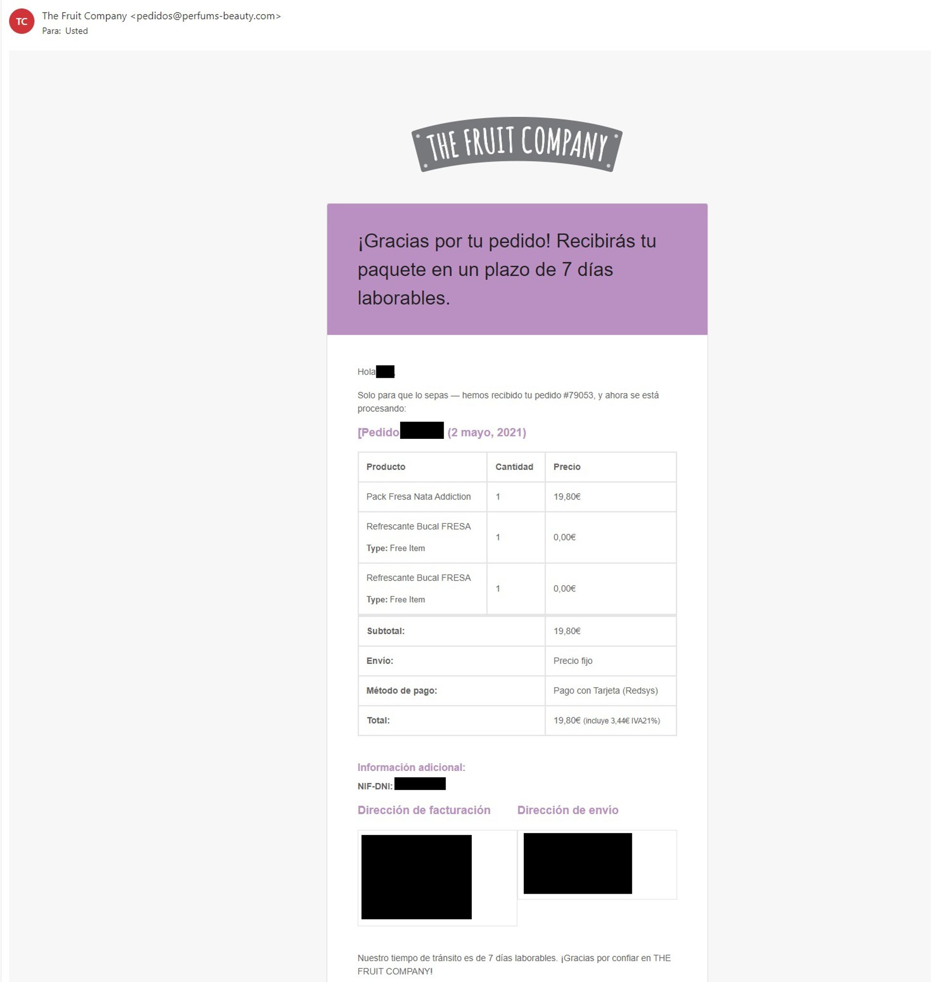 Este ejemplo de email de confirmación de pedido de The Fruit Company tiene toda la información relevante que tú también deberías incluir en este tipo de mensajes: