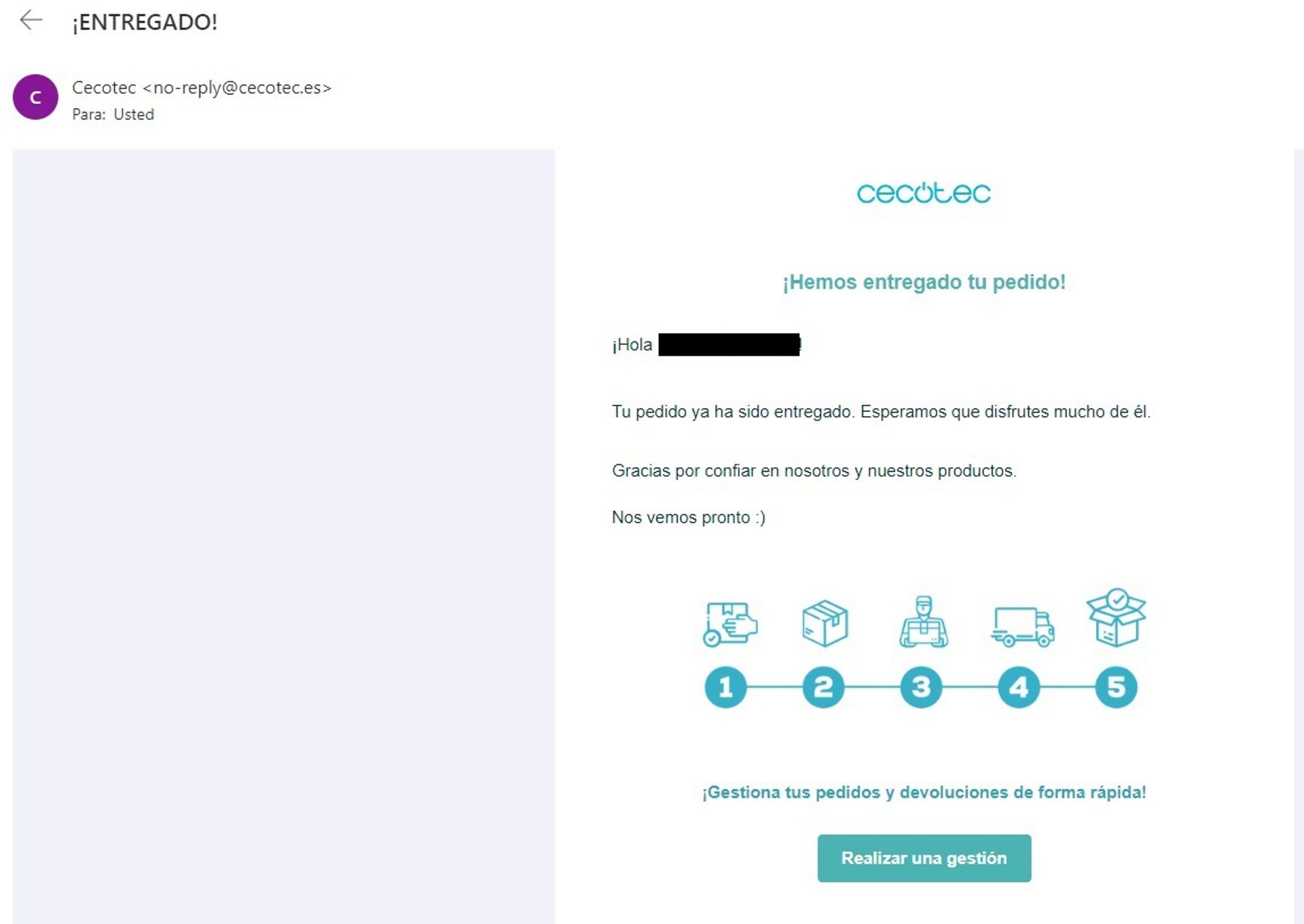 En él, como en este ejemplo de Cecotec, puedes incluir un enlace o información en caso de ser necesaria una devolución o cambio. En este caso, el mensaje también se destaca por hacer un buen uso de los colores corporativos y otros elementos visuales.