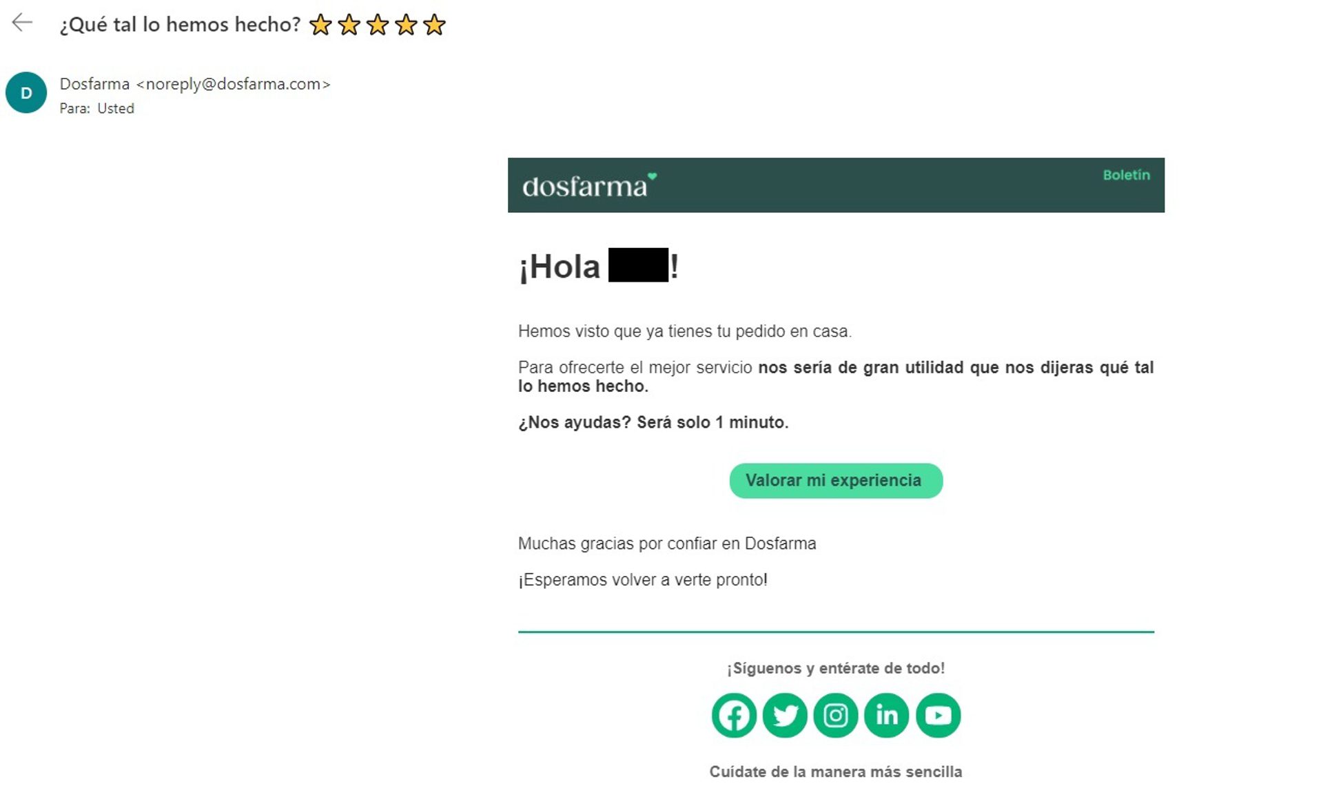 Los puntos a destacar del siguiente ejemplo de email de petición de feedback de Dosfarma son los siguientes: