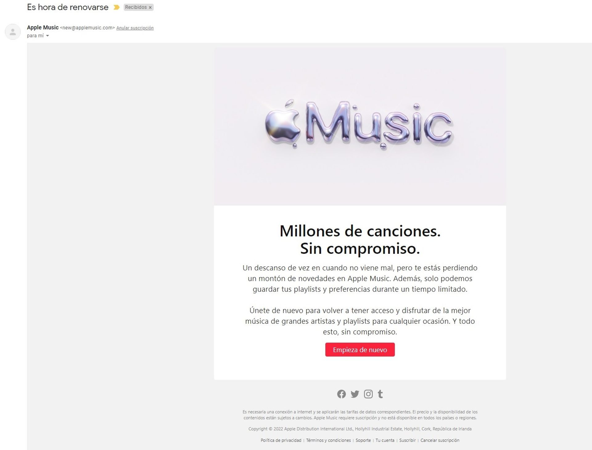 Este tipo de mensajes se pueden implementar en las tiendas online de productos, así como también en las de servicios y suscripciones. Por ejemplo, en este correo electrónico de Apple Music, se anima a los antiguos suscriptores a volver a ser clientes activos de la plataforma.