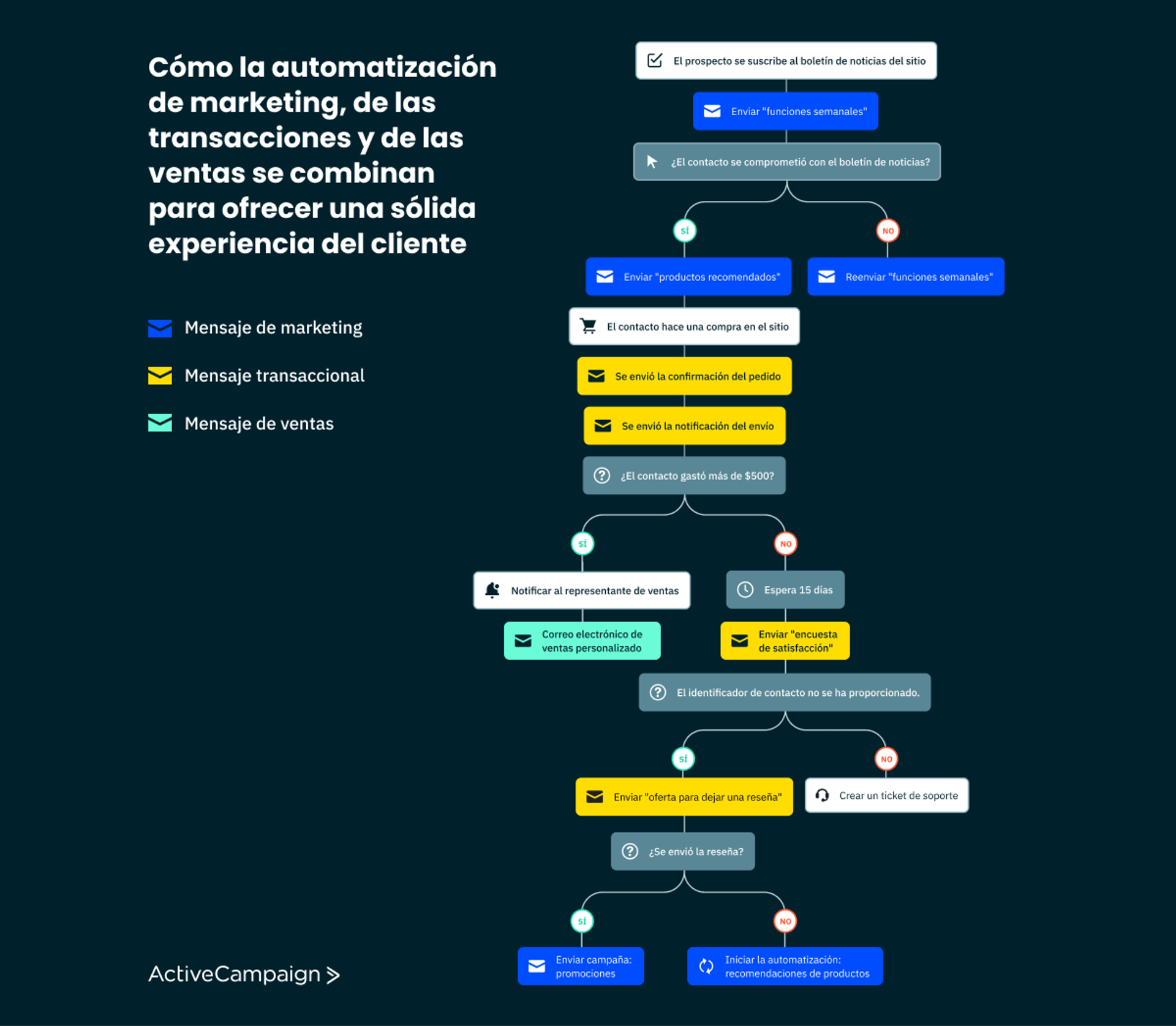 - ActiveCampaign aporta potencia empresarial a negocios de todos los tamaños. Somos líderes en la automatización de marketing y hacemos que la automatización sea posible para todos, independientemente de la experiencia, a través de recetas creadas previamente y de un generador visual intuitivo de automatizaciones. Ahora nos comprometemos a ser la primera plataforma en brindar recetas para el correo electrónico transaccional.