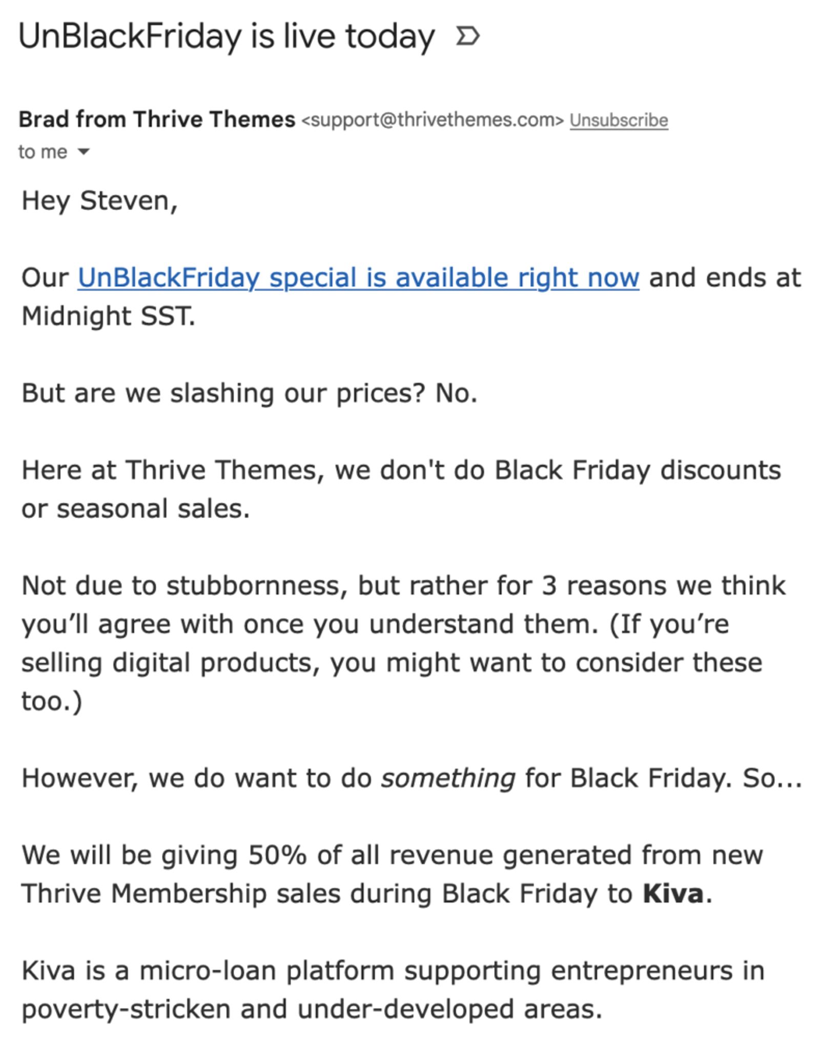 Puede que las rebajas del Black Friday vayan en contra de tu modelo de negocio. En este ejemplo, Thrive Themes, cliente de ActiveCampaign, comparte su especial "UnBlackFriday".