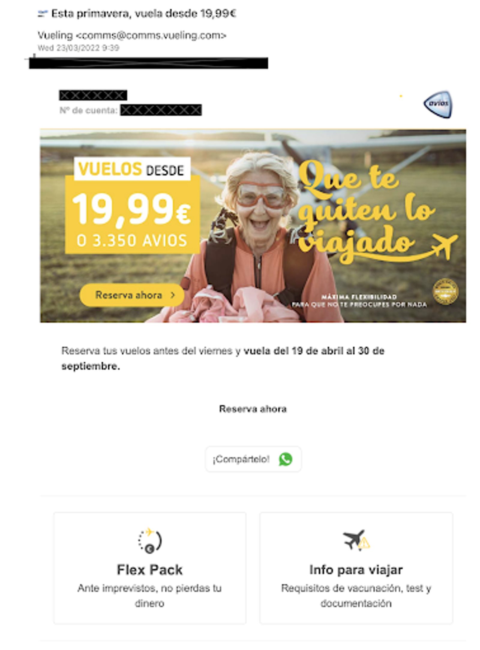 También aprovechan el boletín para informar a sus suscriptores sobre nuevas oportunidades, como la de acumular puntos Avios tras una compra.